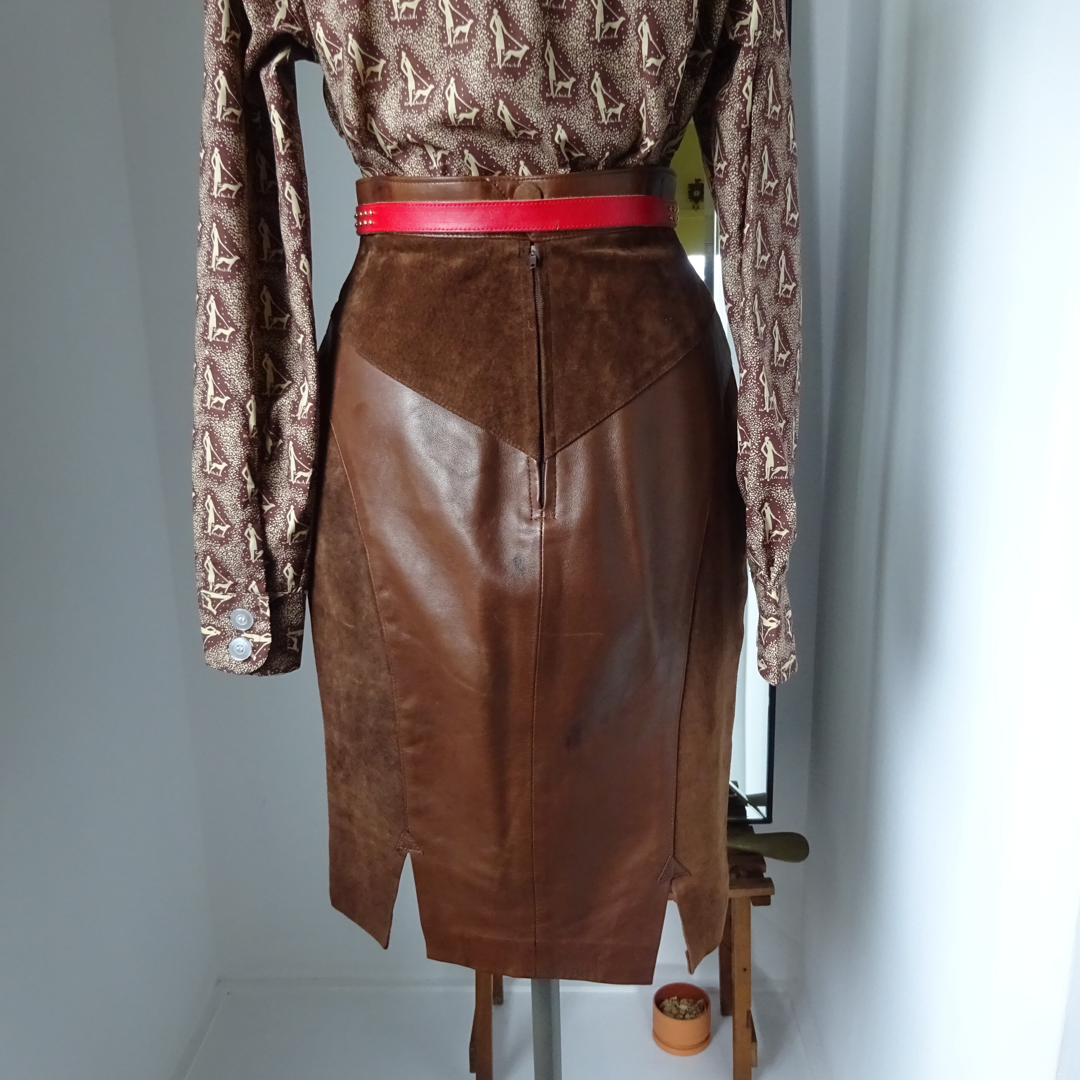 レザースカートは可愛いけど合わせ方や着方が難しいものも多いと思いますが、ブラウンの優しい色合いや細見えの視覚効果があるスエードの切り替えがとても効いていて、ヒップや腰回りの曲線も美しいので合わせやすいです。
