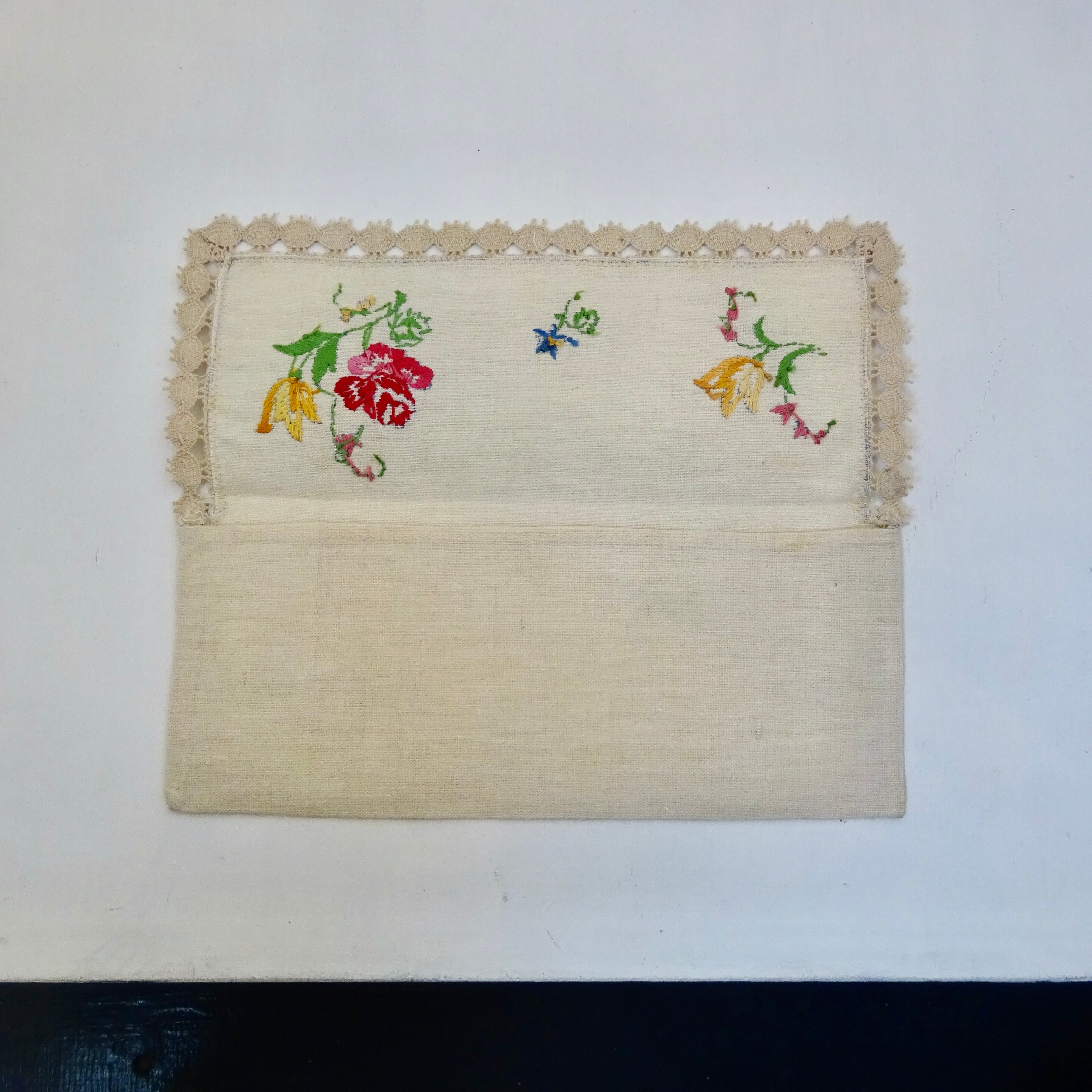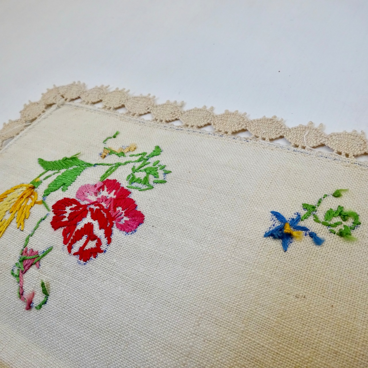 リネンに可愛らしいお花が刺繍された素朴なパース