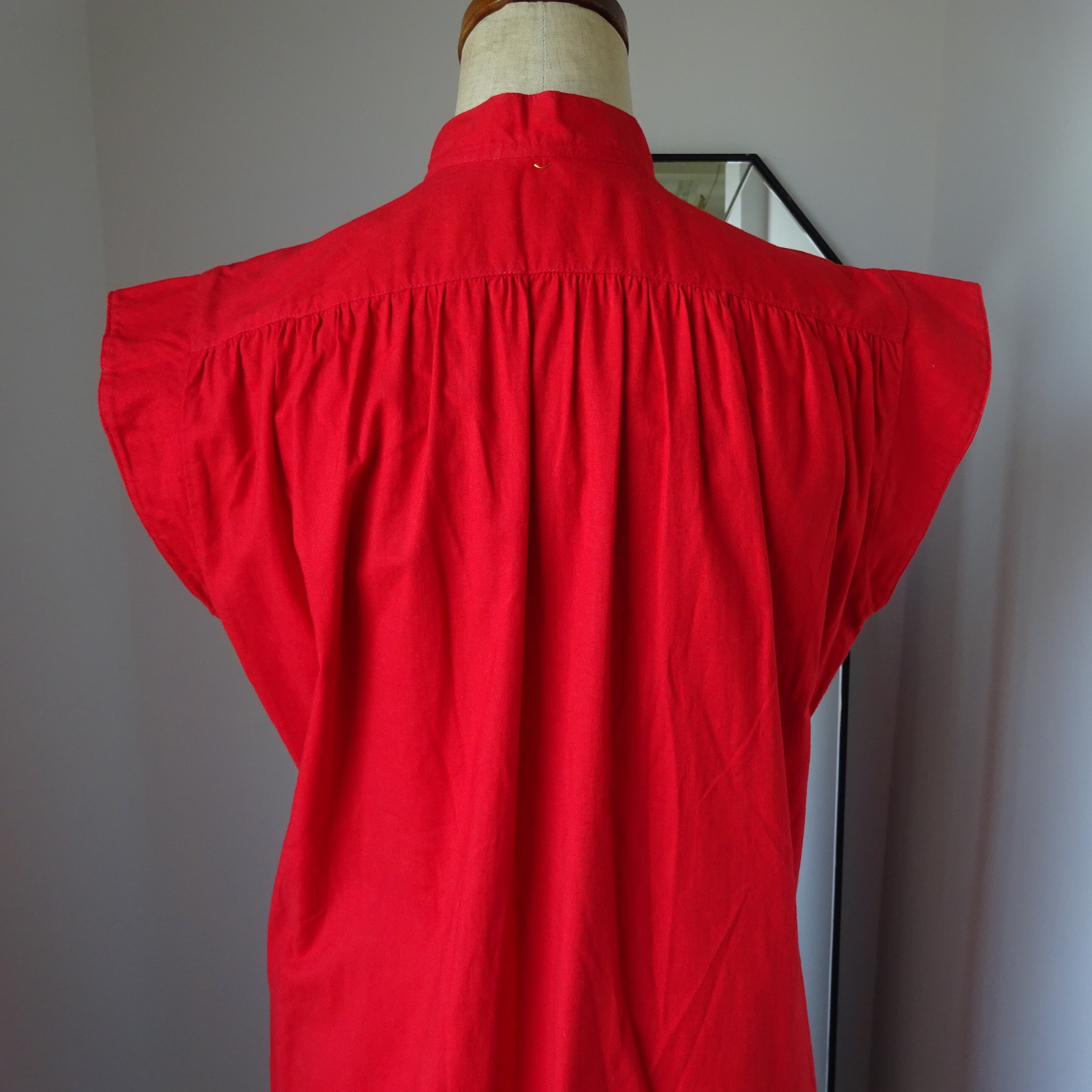 とてもしっかりした生地で、恐らくコットン又はコットンと麻の混合かと思われます。ツンと尖った袖先やスタンドカラーがアクセントになっています。