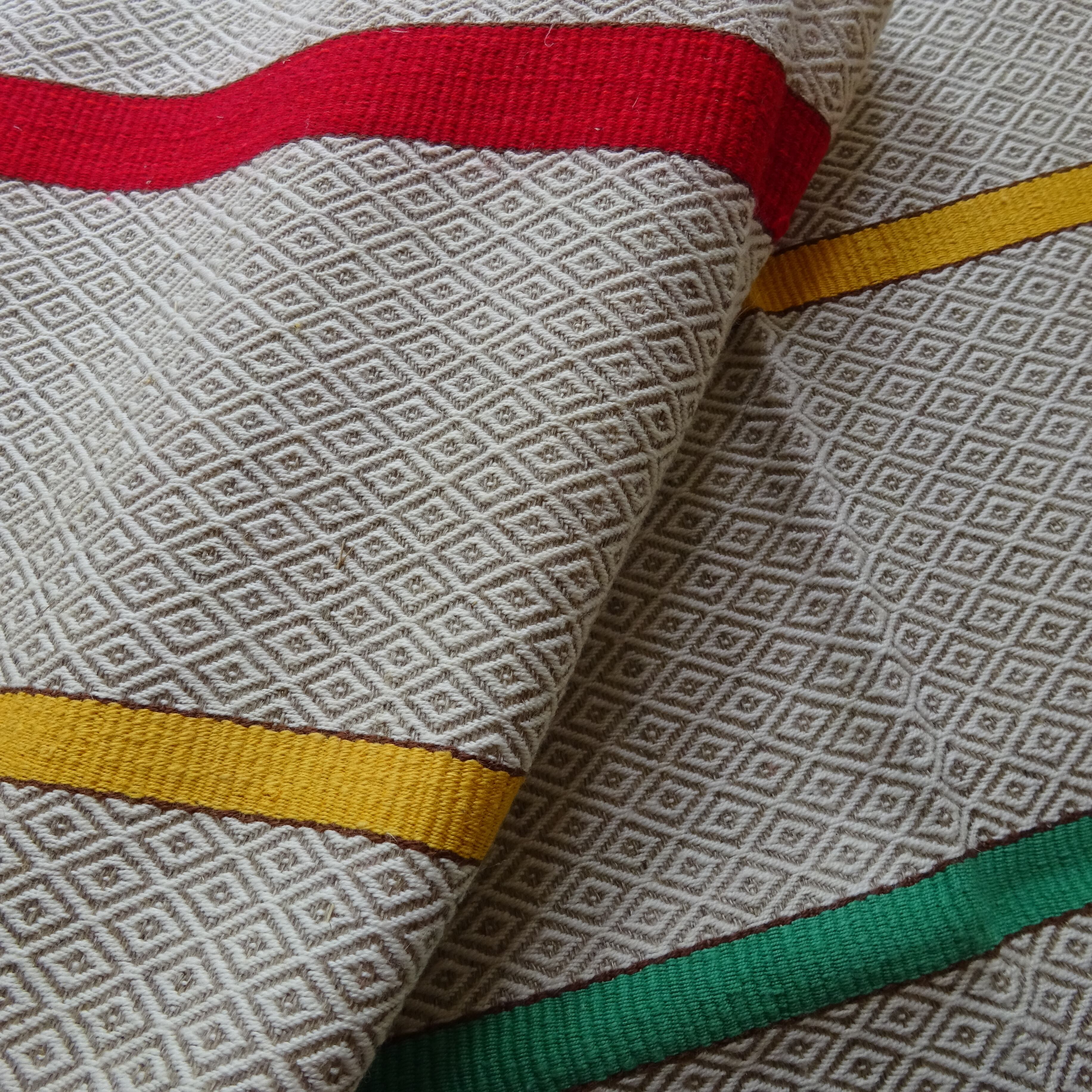 ジャガード織りに、とても良い色合いのストライプが入ったデザインで、サイドは耳になっています。
