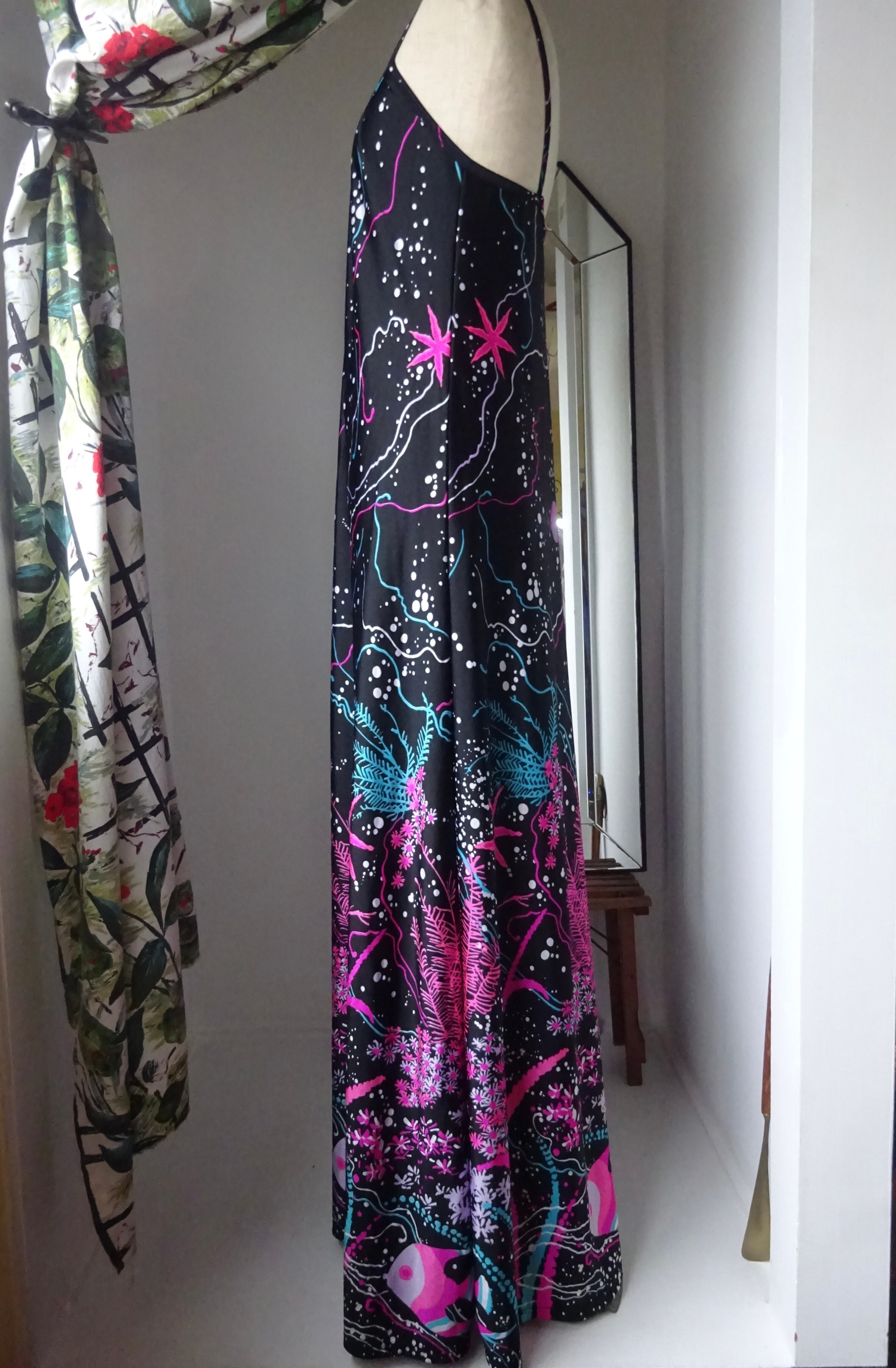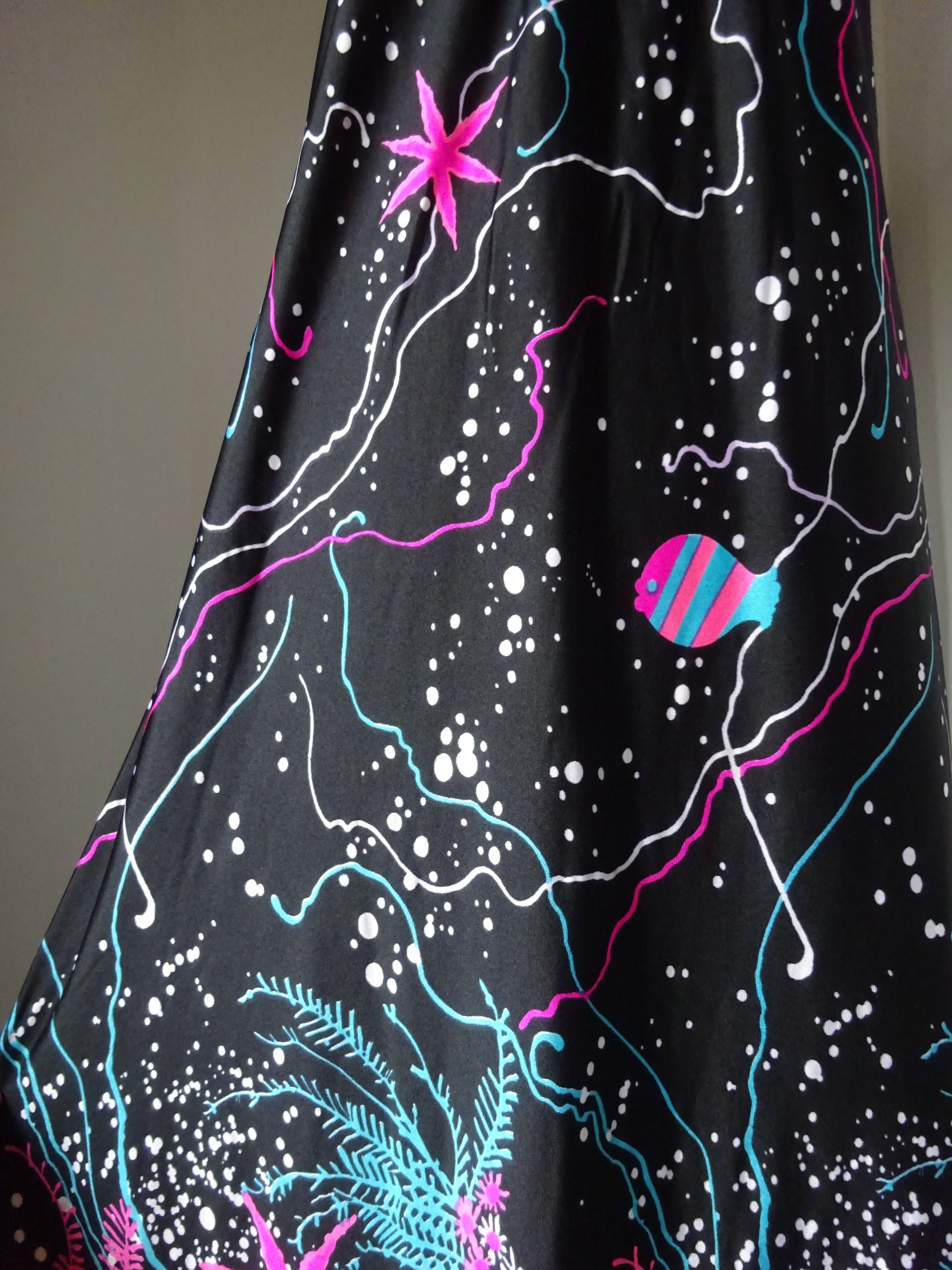 ネオンカラーの熱帯魚と深海の真っ黒な色合いがとても美しいスペシャルなロングドレス