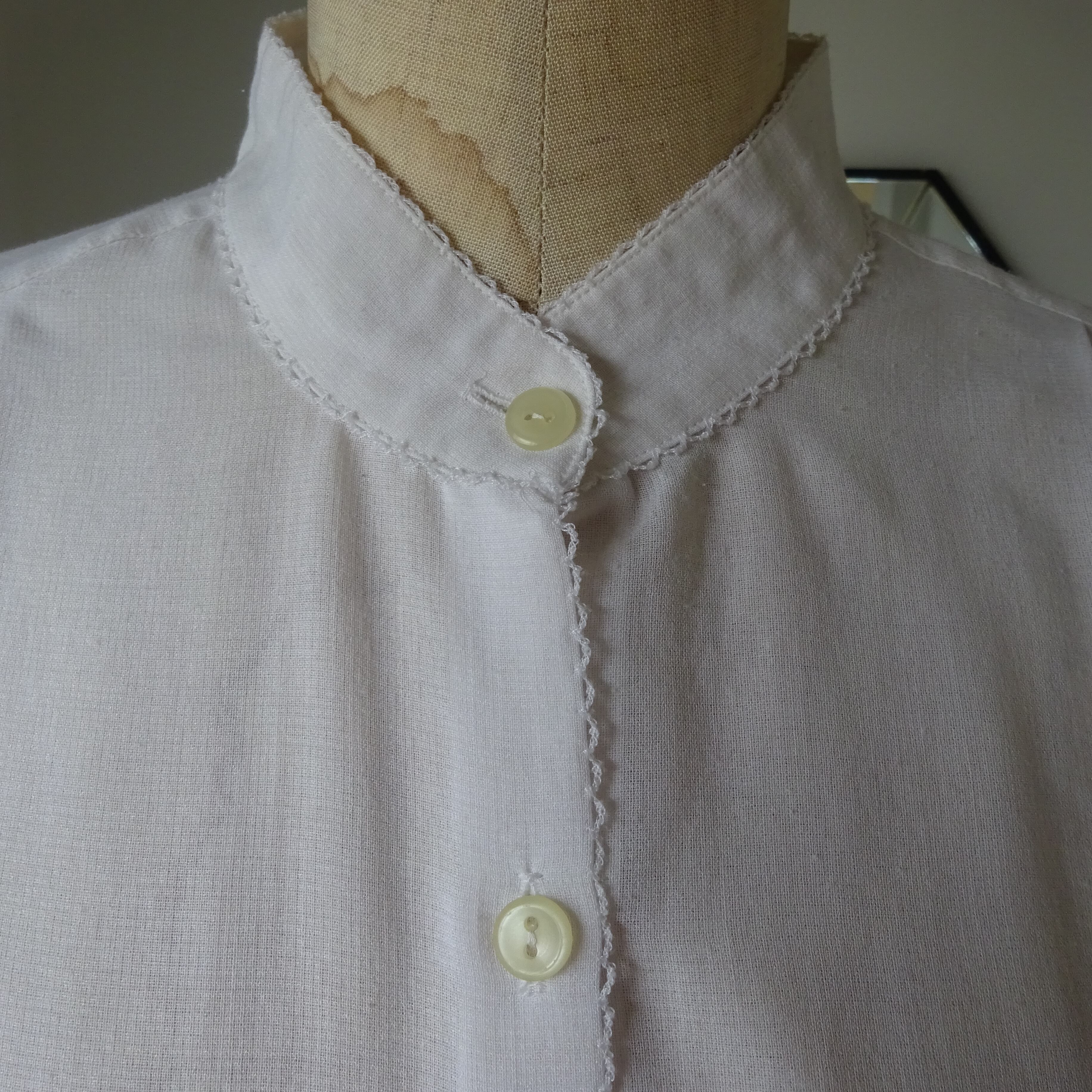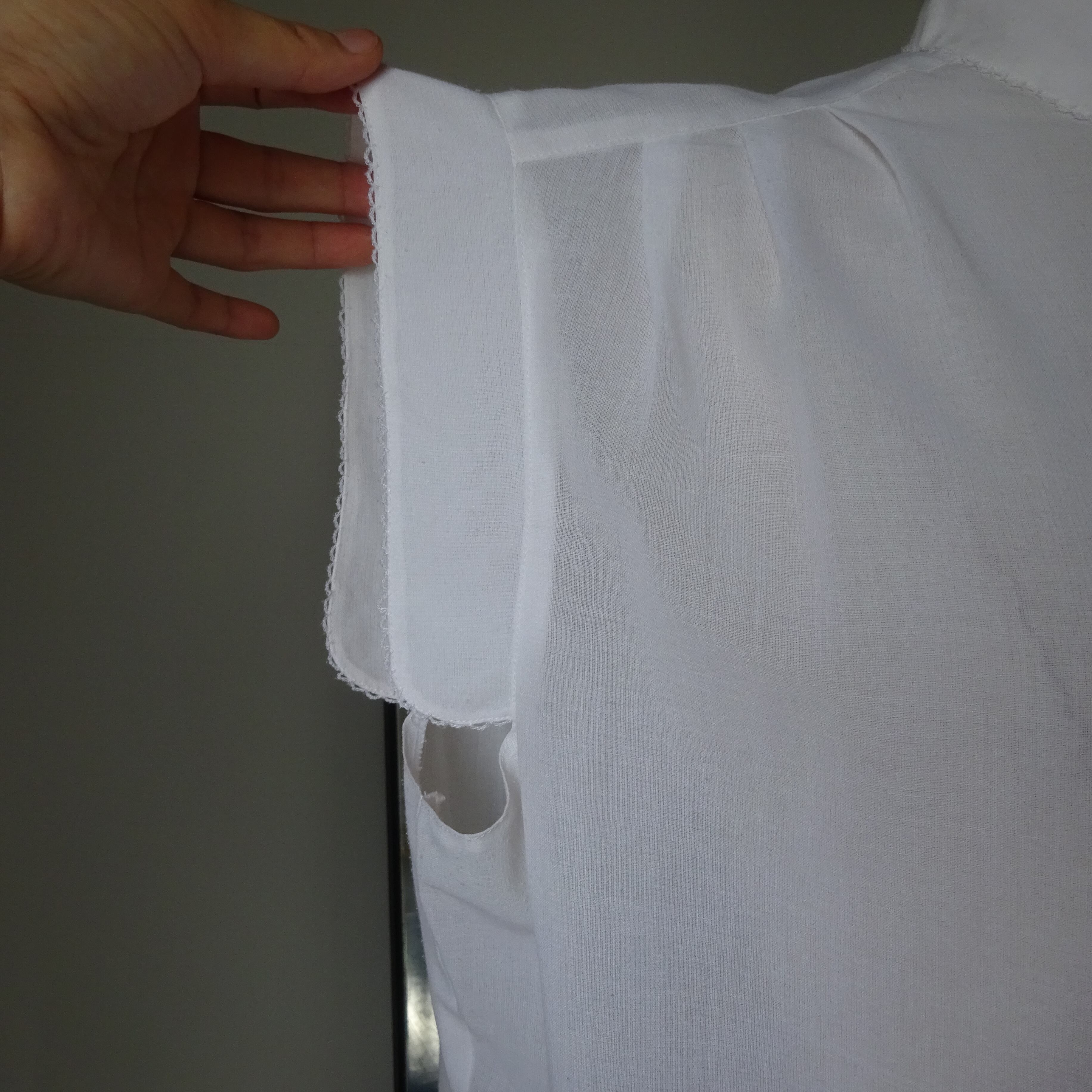 透け感のある化繊の薄手素材とスカラップ、身幅に対してとても短い袖