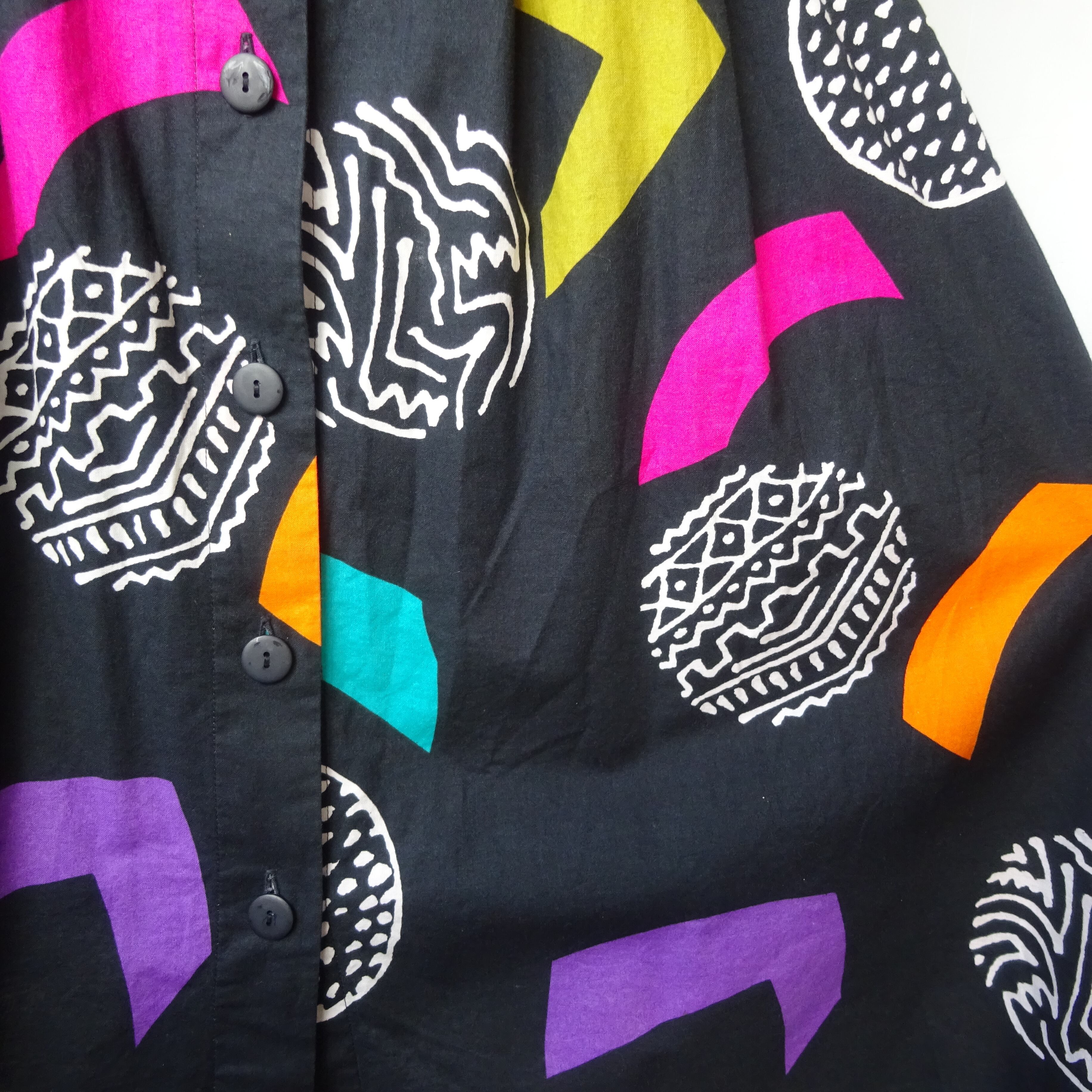 パッと目を惹くネオンカラーの大きな柄は黒地にとてもよく映えます。