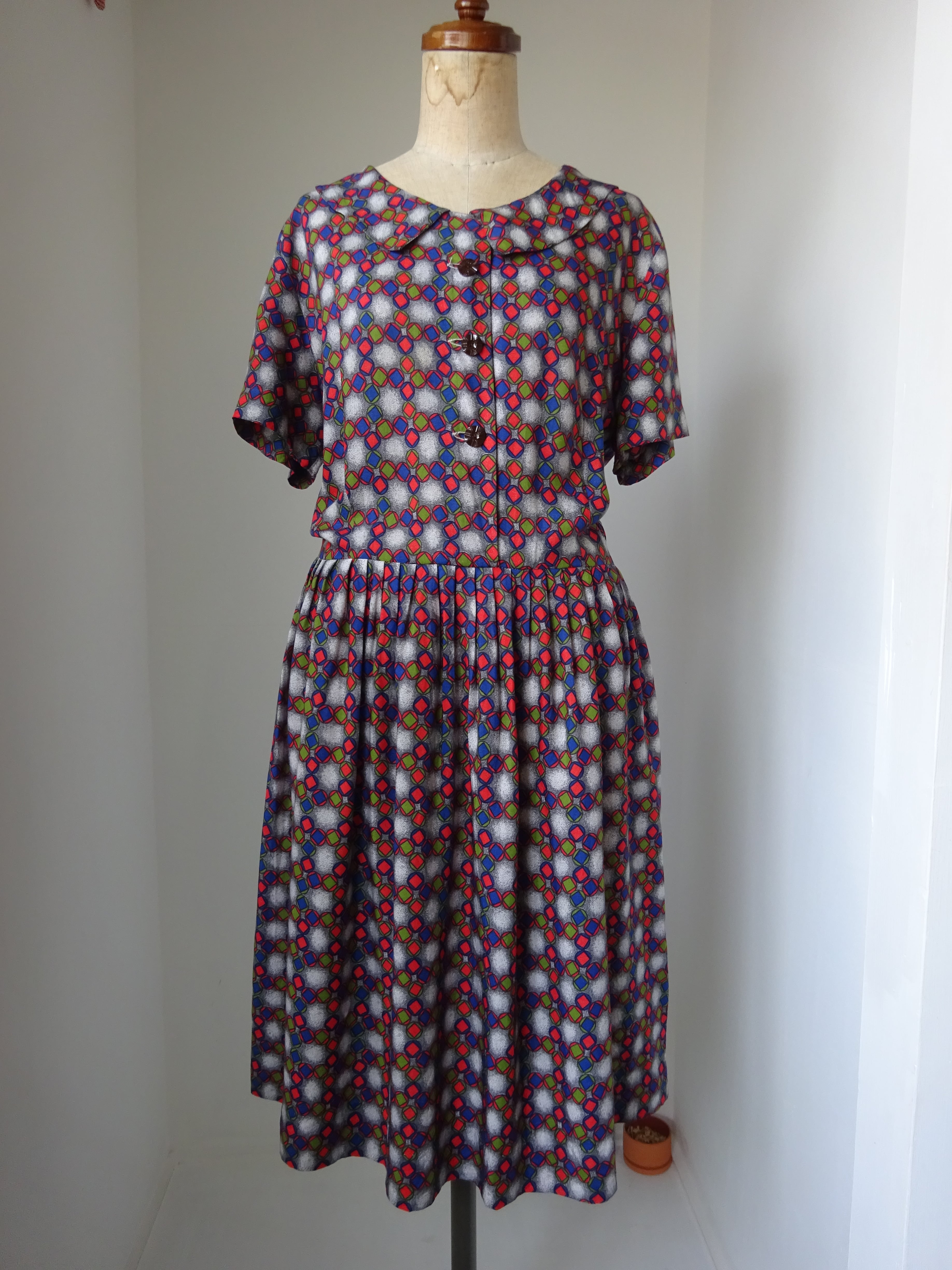 大きいラウンドカラーと、幾何学模様のテキスタイル