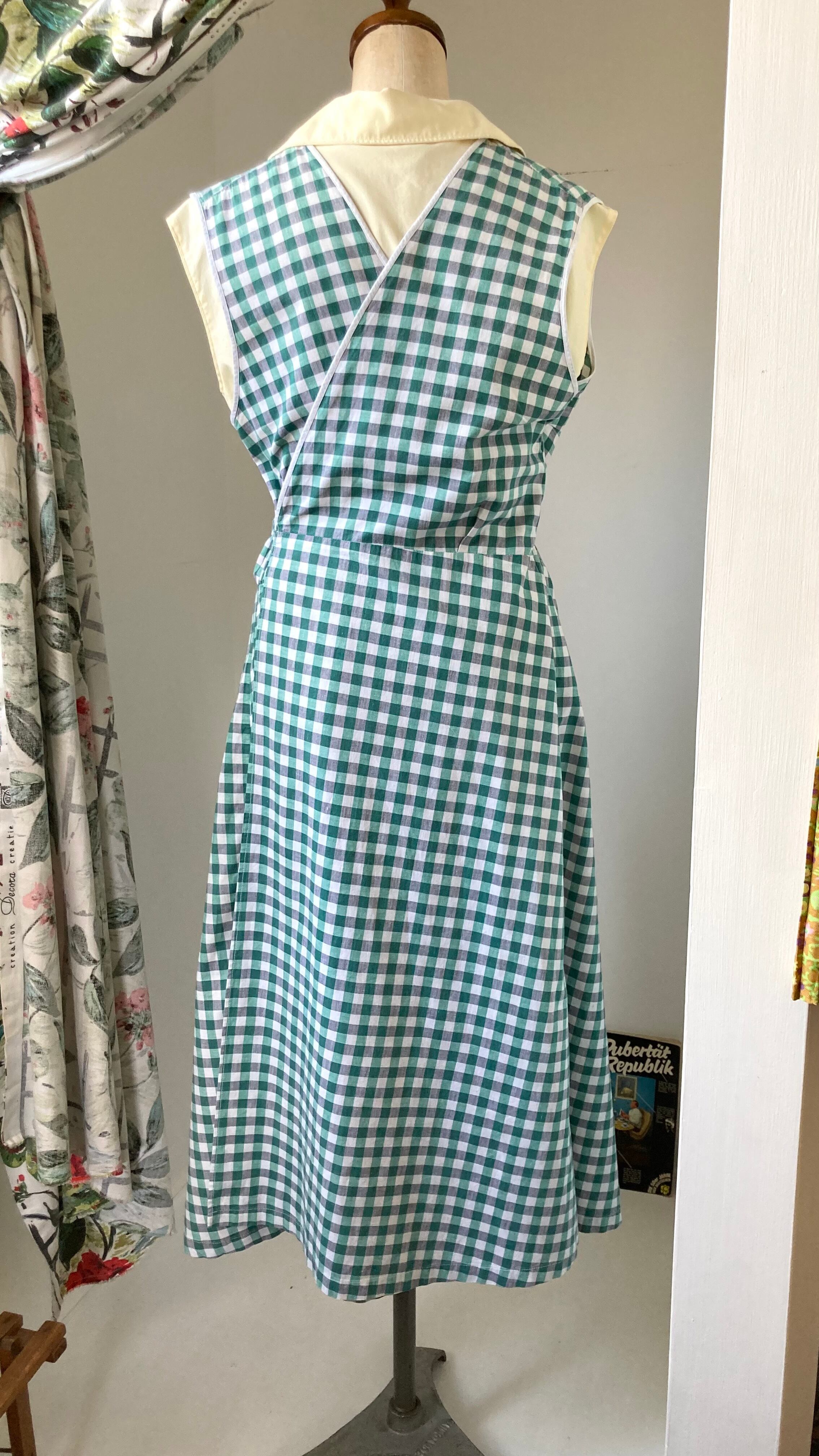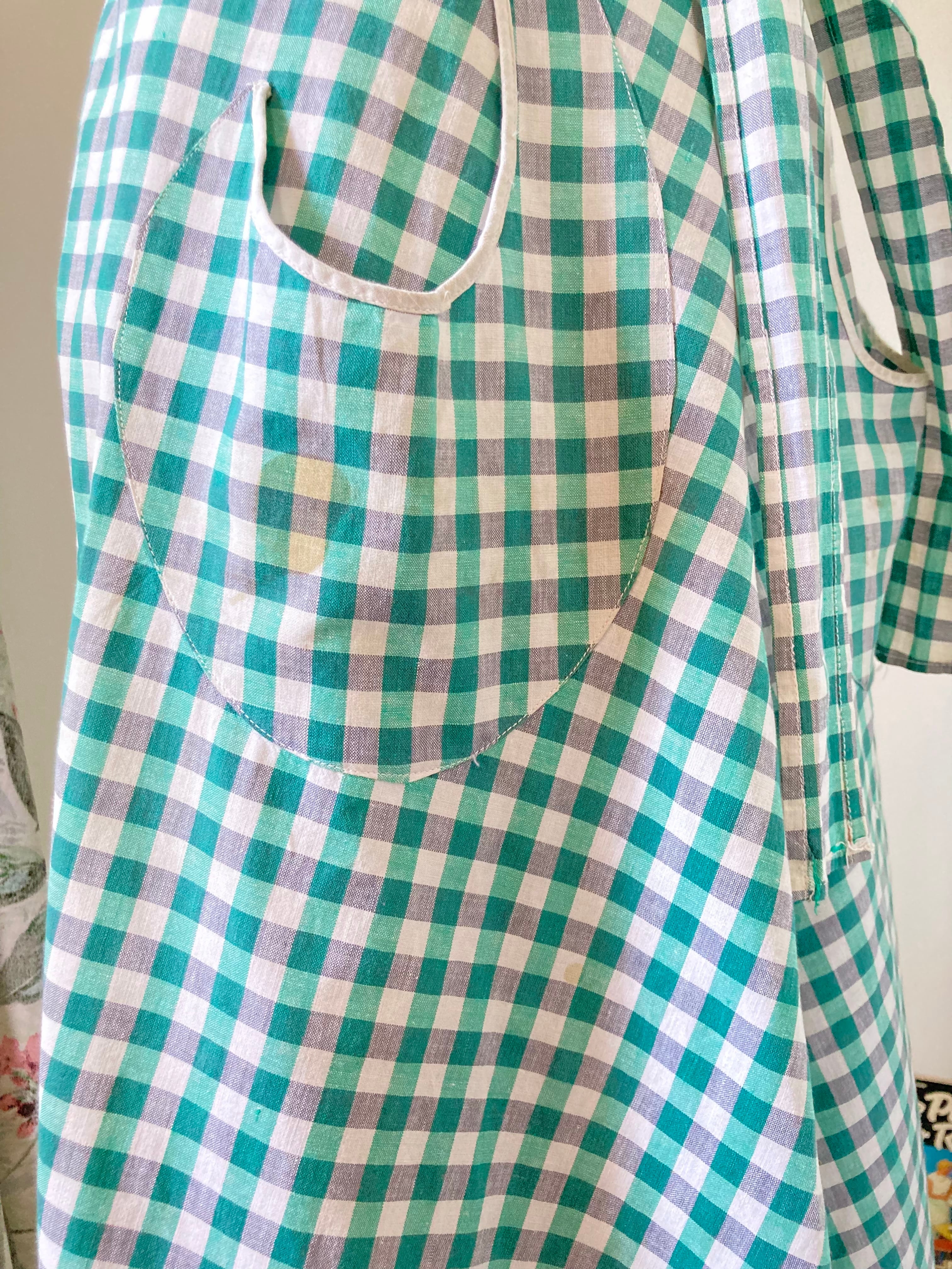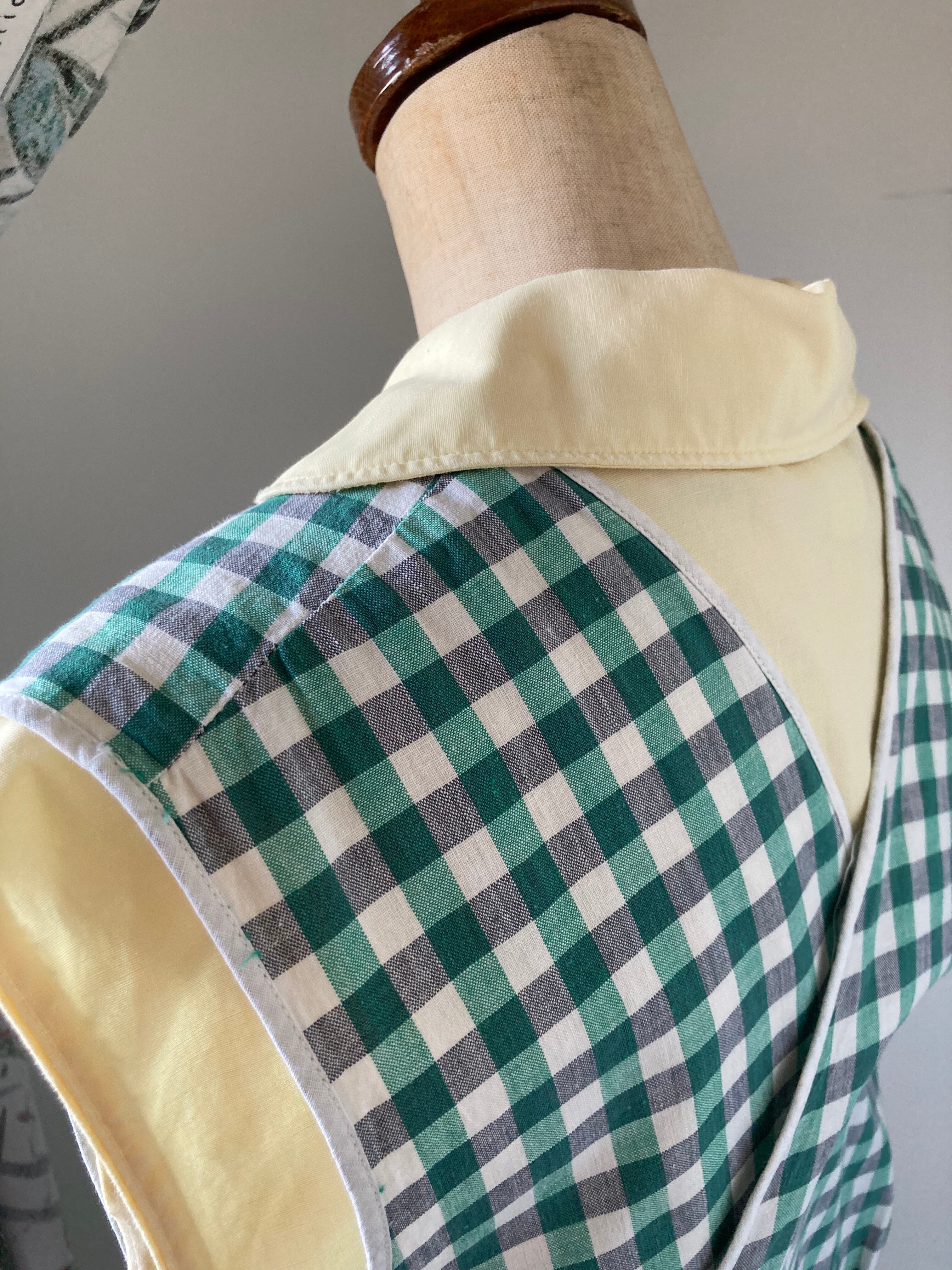 ワンピースのような、お洋服の上からパッと羽織るタイプのエプロンで、中に何かご着用するように少しゆとりのある作りとなっています。