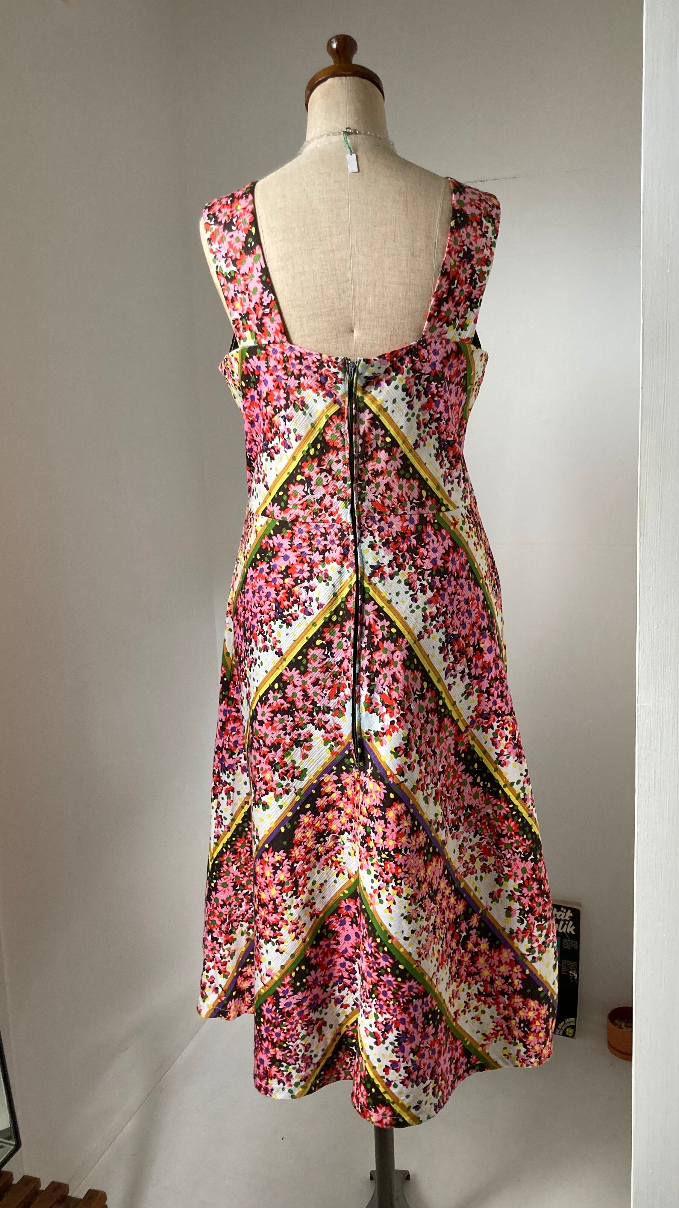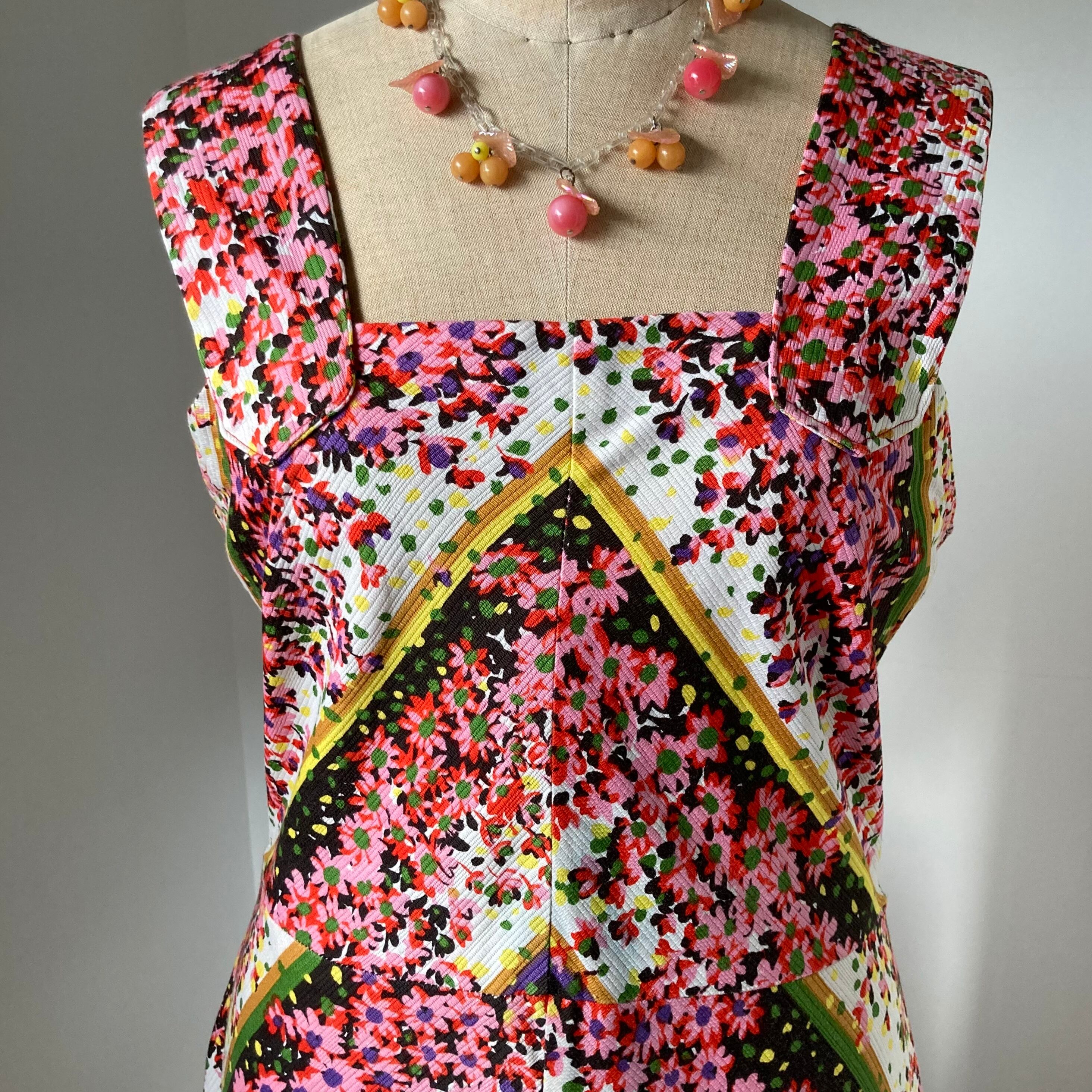 凹凸のある独特な生地にハッキリした色合いのお花がプリントされているドレス。