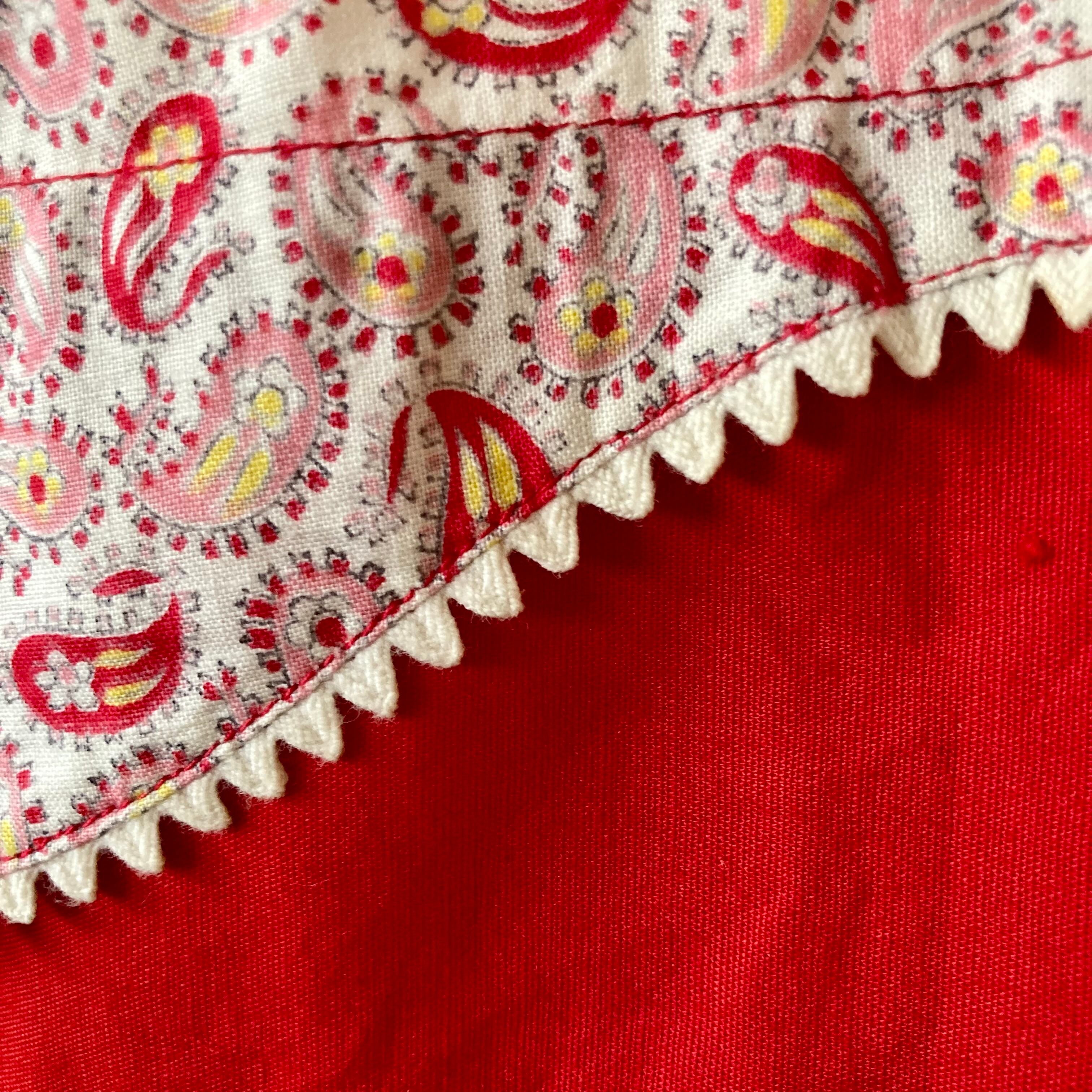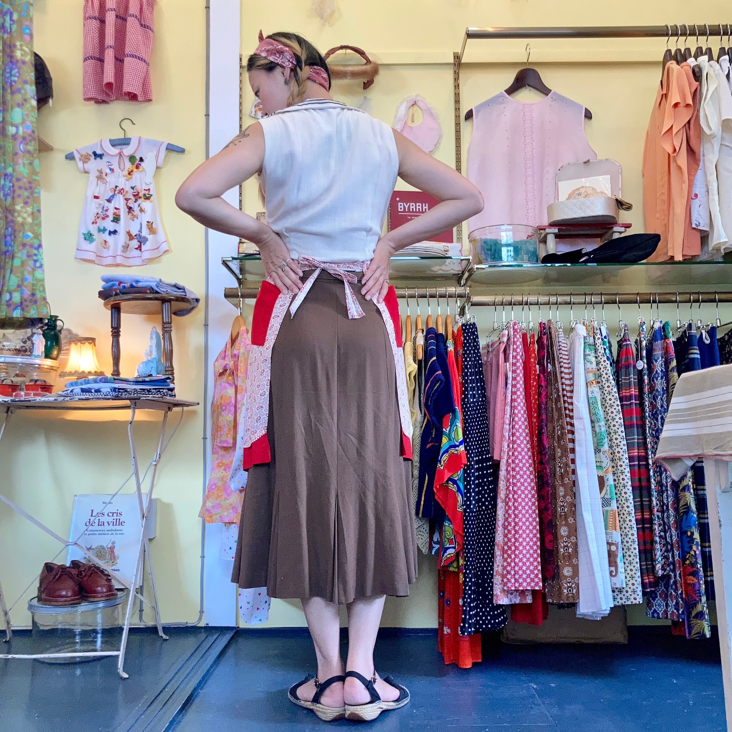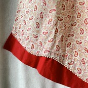 サロンタイプのシンプルな作りですが、ウエストのプリーツや裾の波なみのデザイン、小さなお花が入ったペイズリー柄