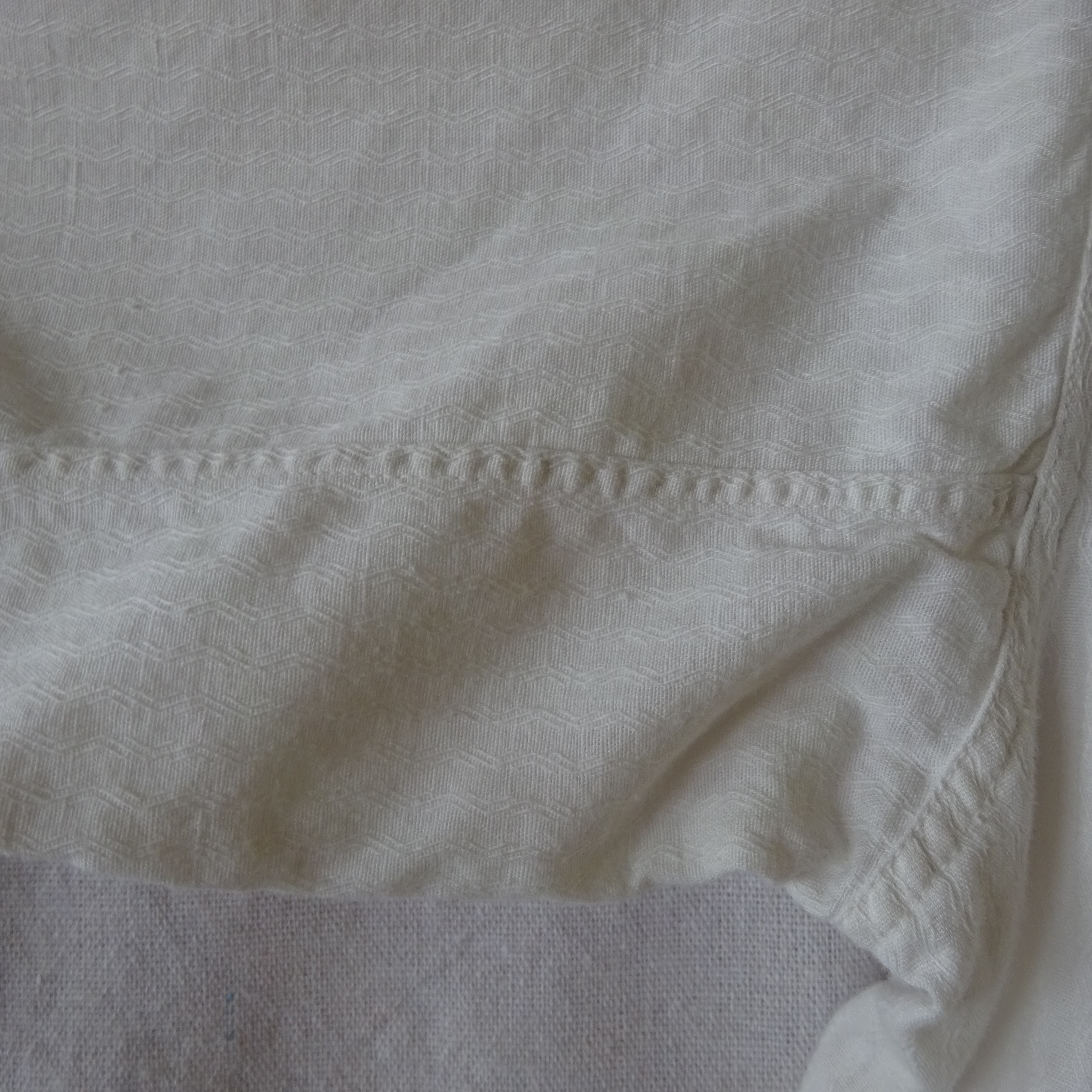 当時はパンツにベルトループがなく、履く時はサスペンダーで釣って着用していた為裾が飛び出さないようにとても長く作られています。