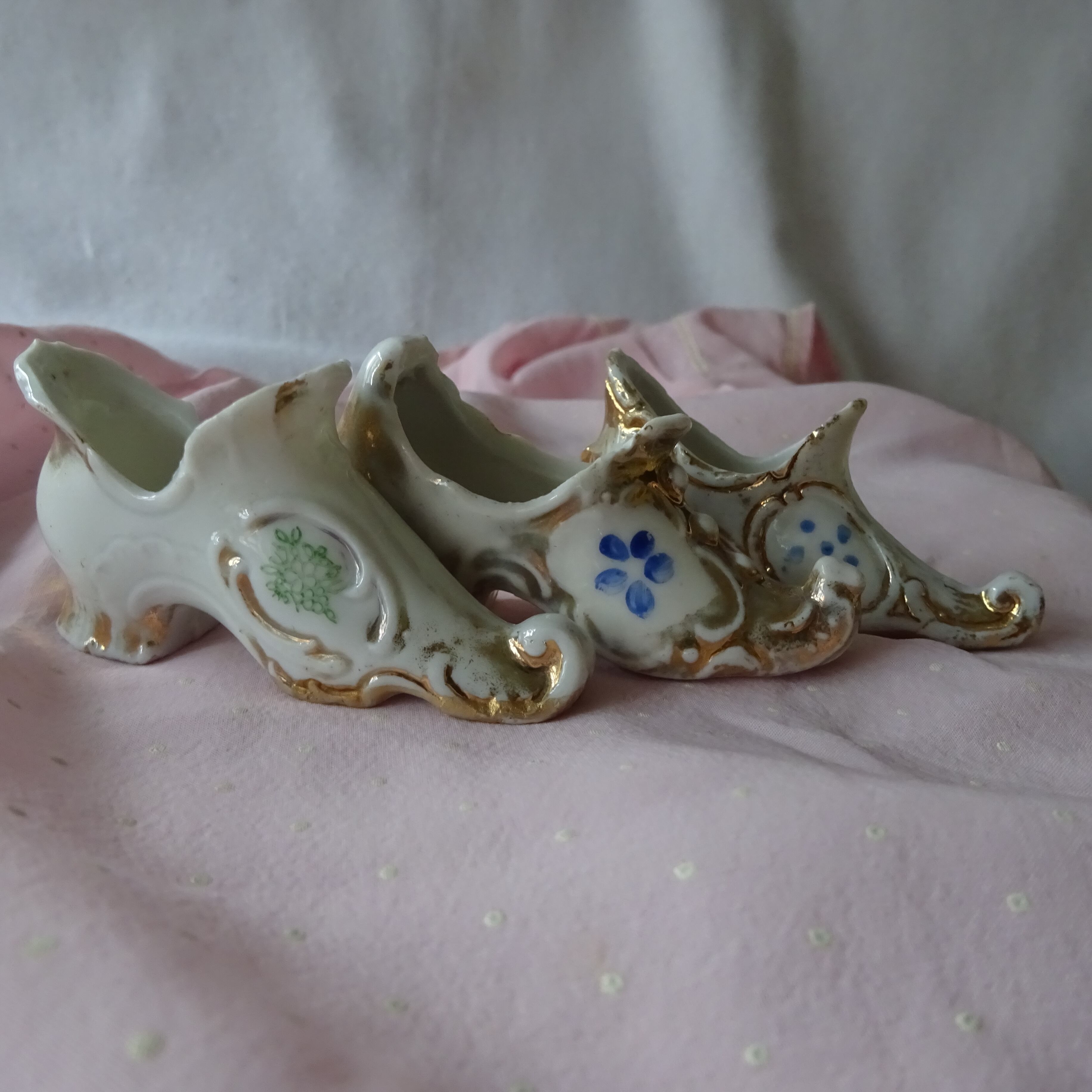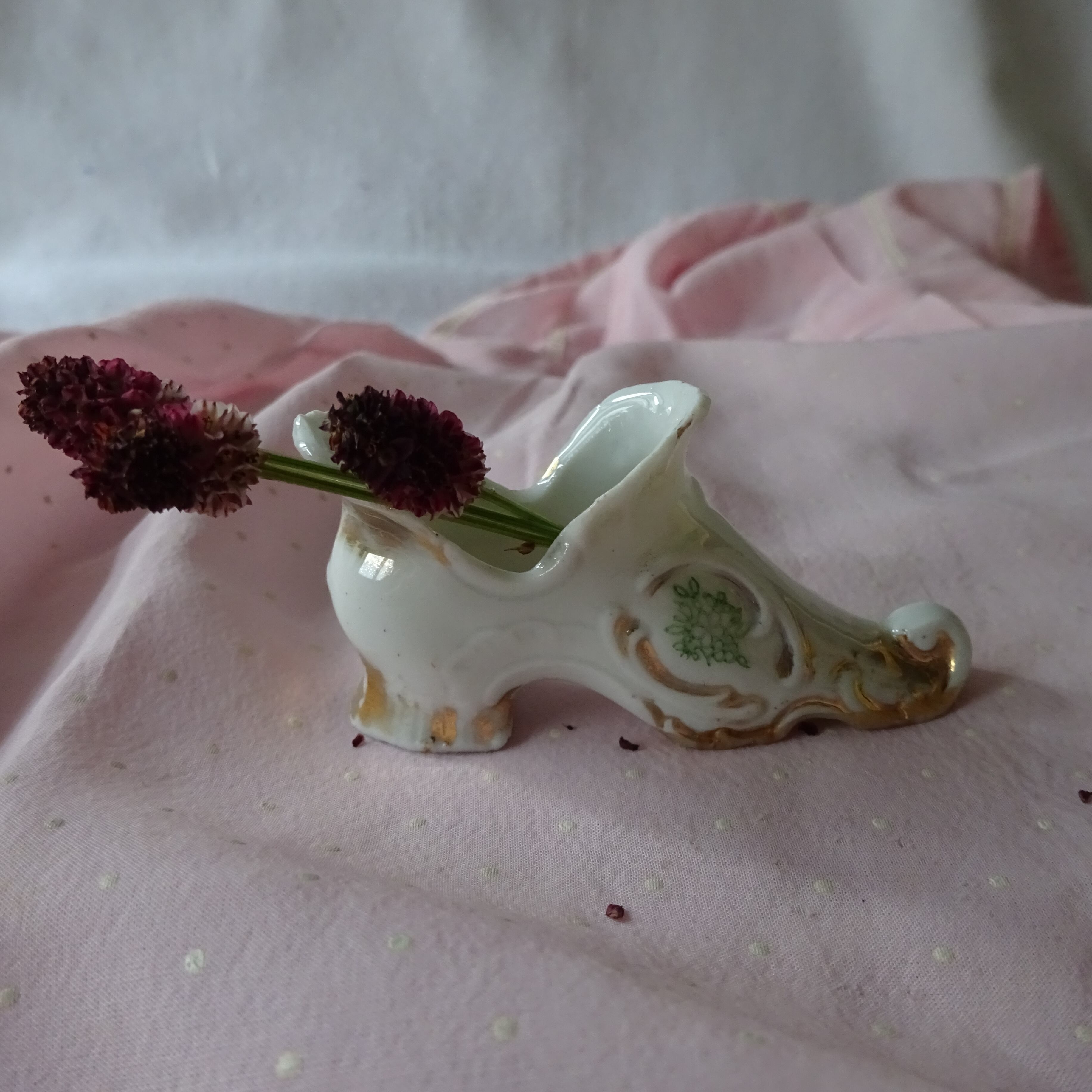 アンティークのパンプスデザイン、恐らくピンクッションの土台かと思われる、陶器の靴です。