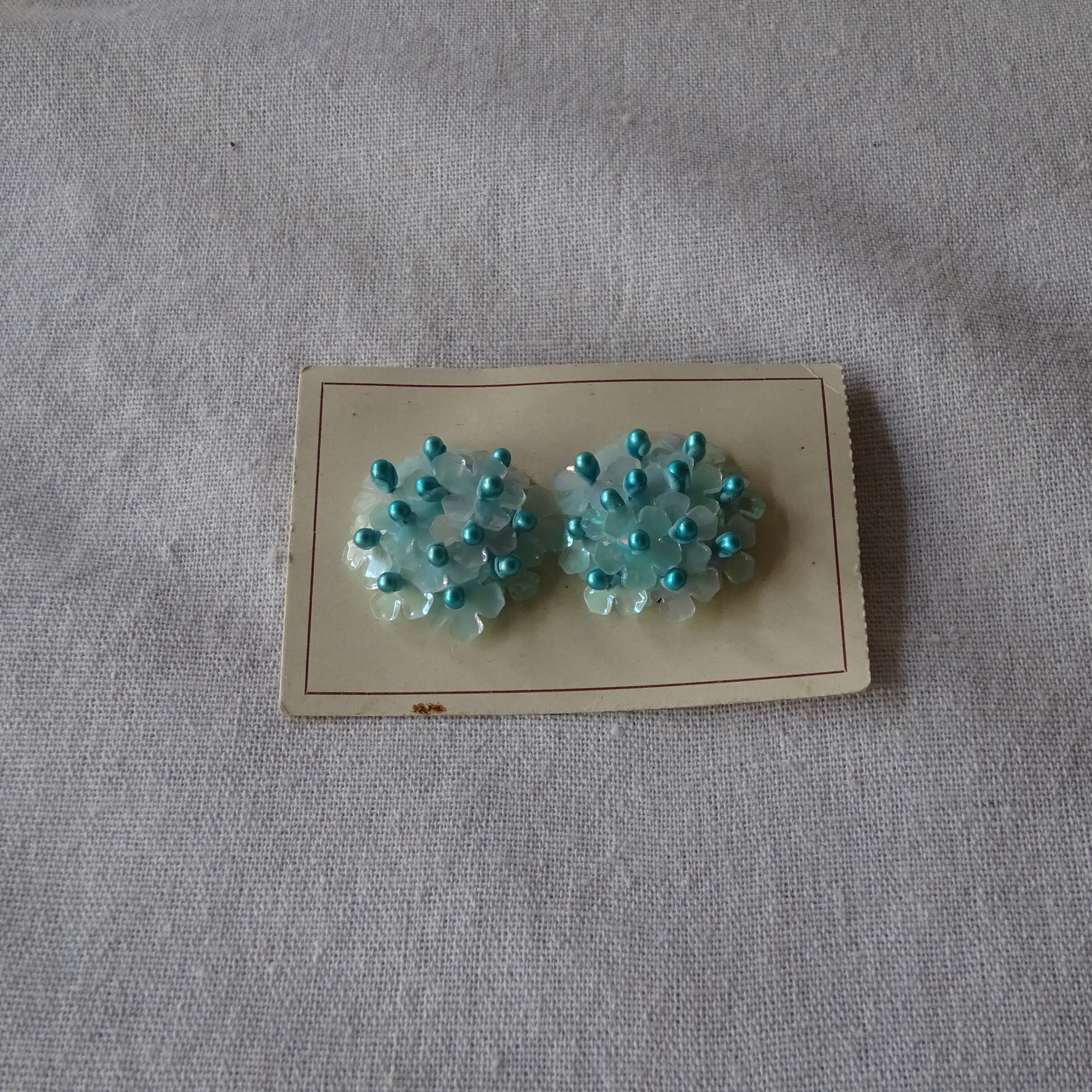 ほんのりピンク色のオーロラカラーに光る水色のお花がたくさん付いた大きなイヤリング