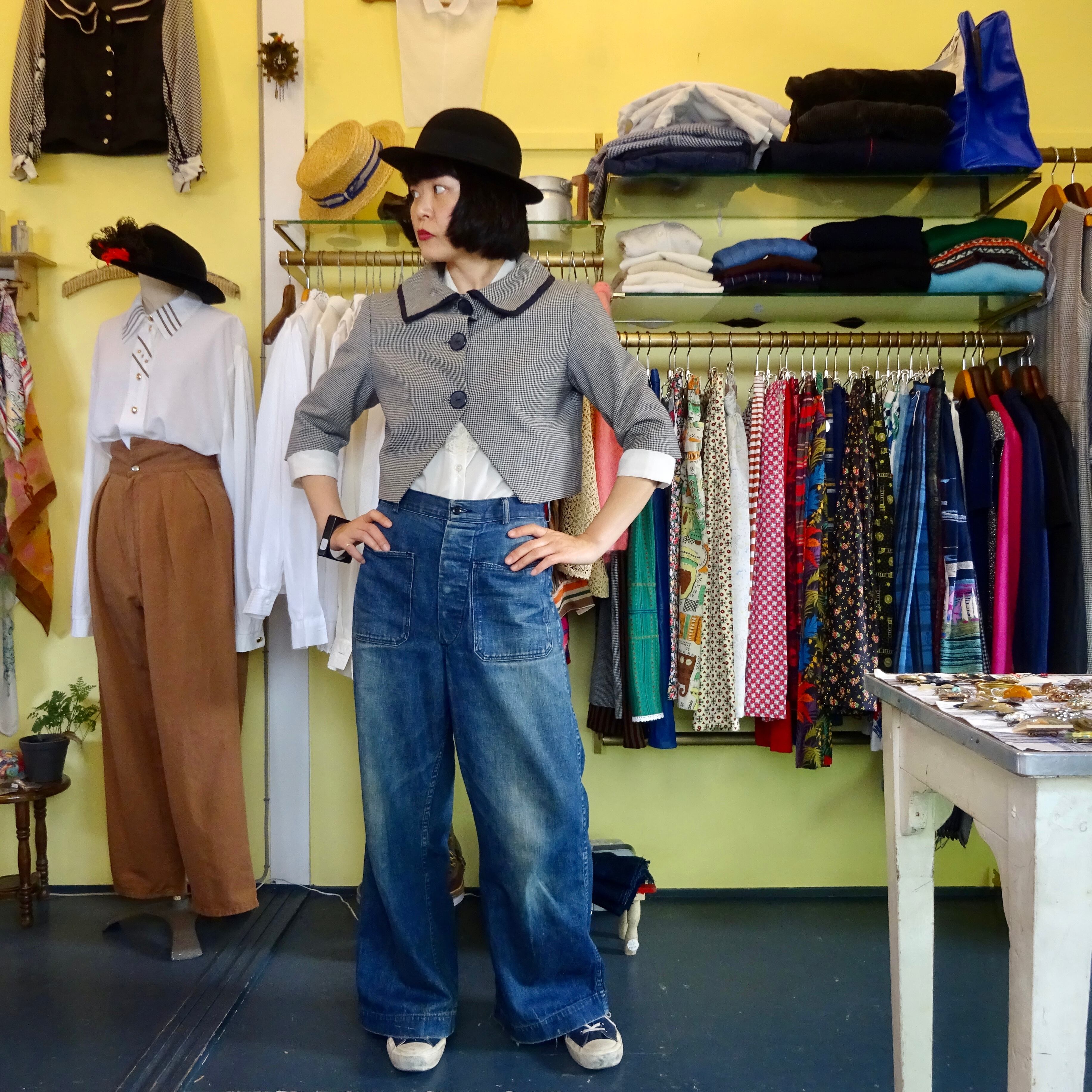 この頃に流行っていた大きな襟や大きなボタン、そして珍しい裾のカットワーク。