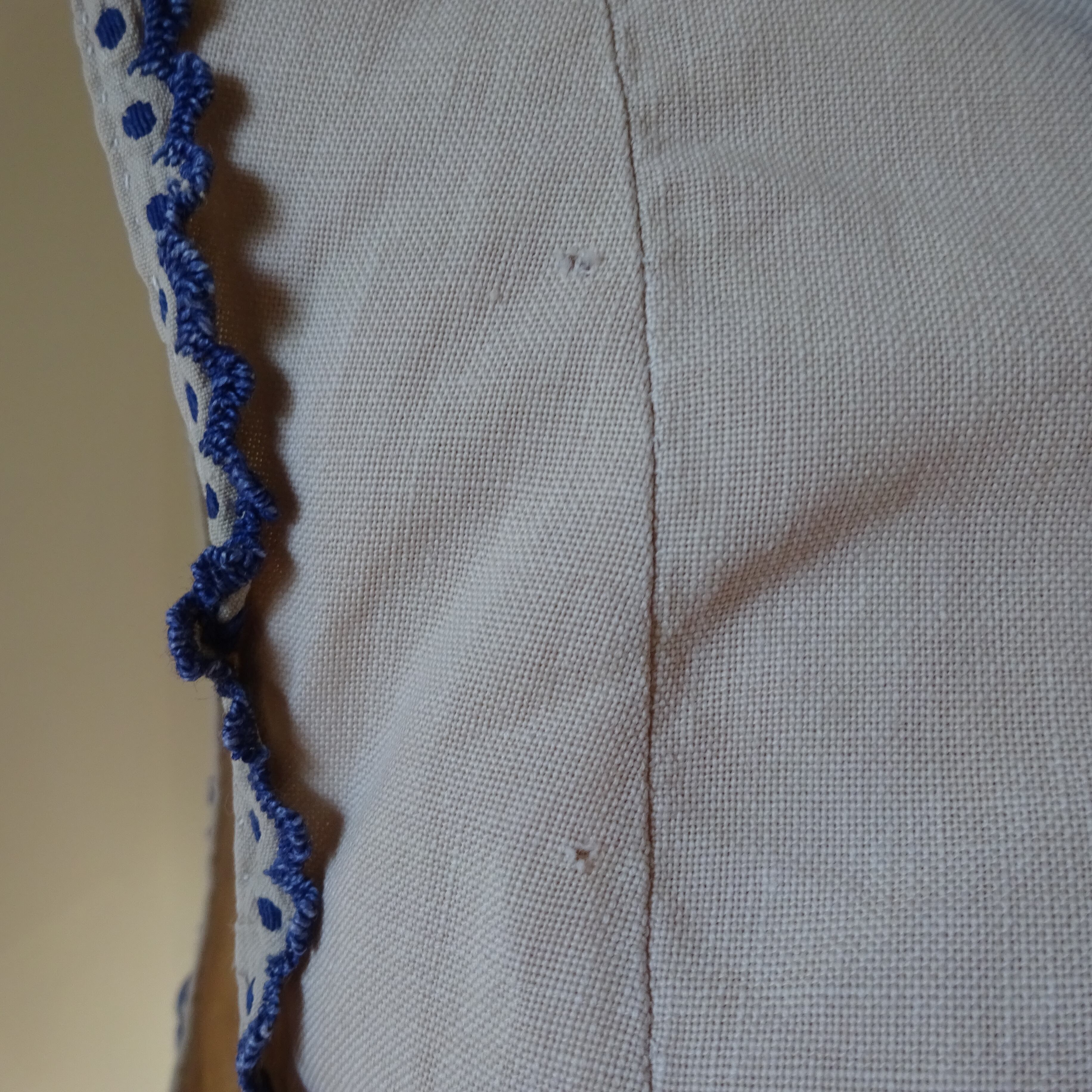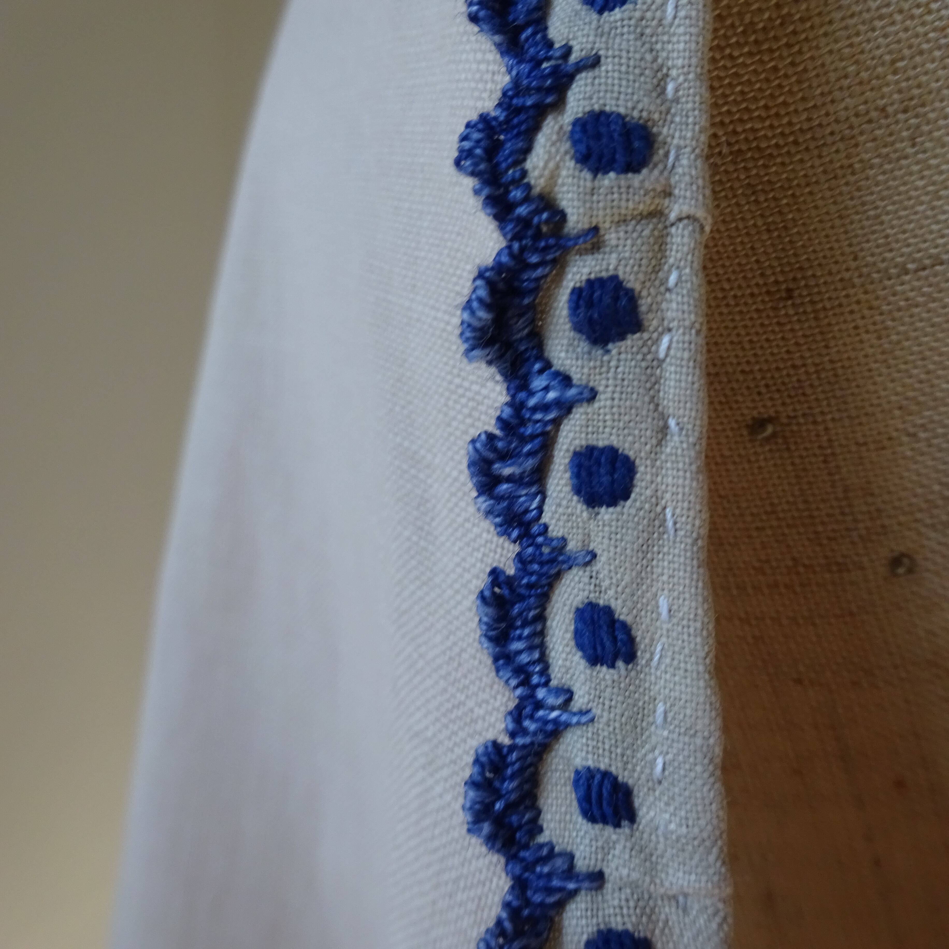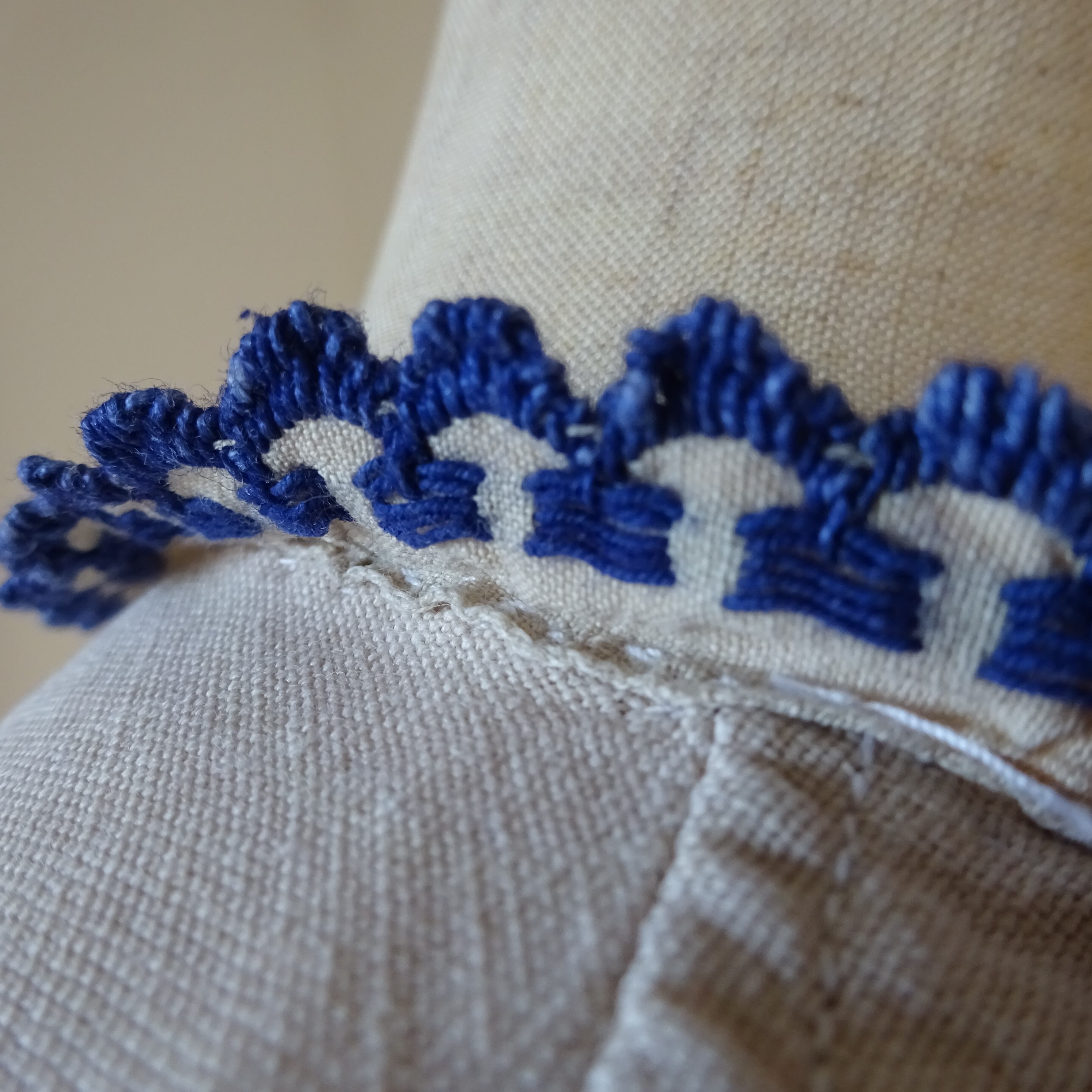 なんともフランスのアンティークっぽい柔らかなベージュ色に濃い青の刺繍がとても可愛らしい一枚。