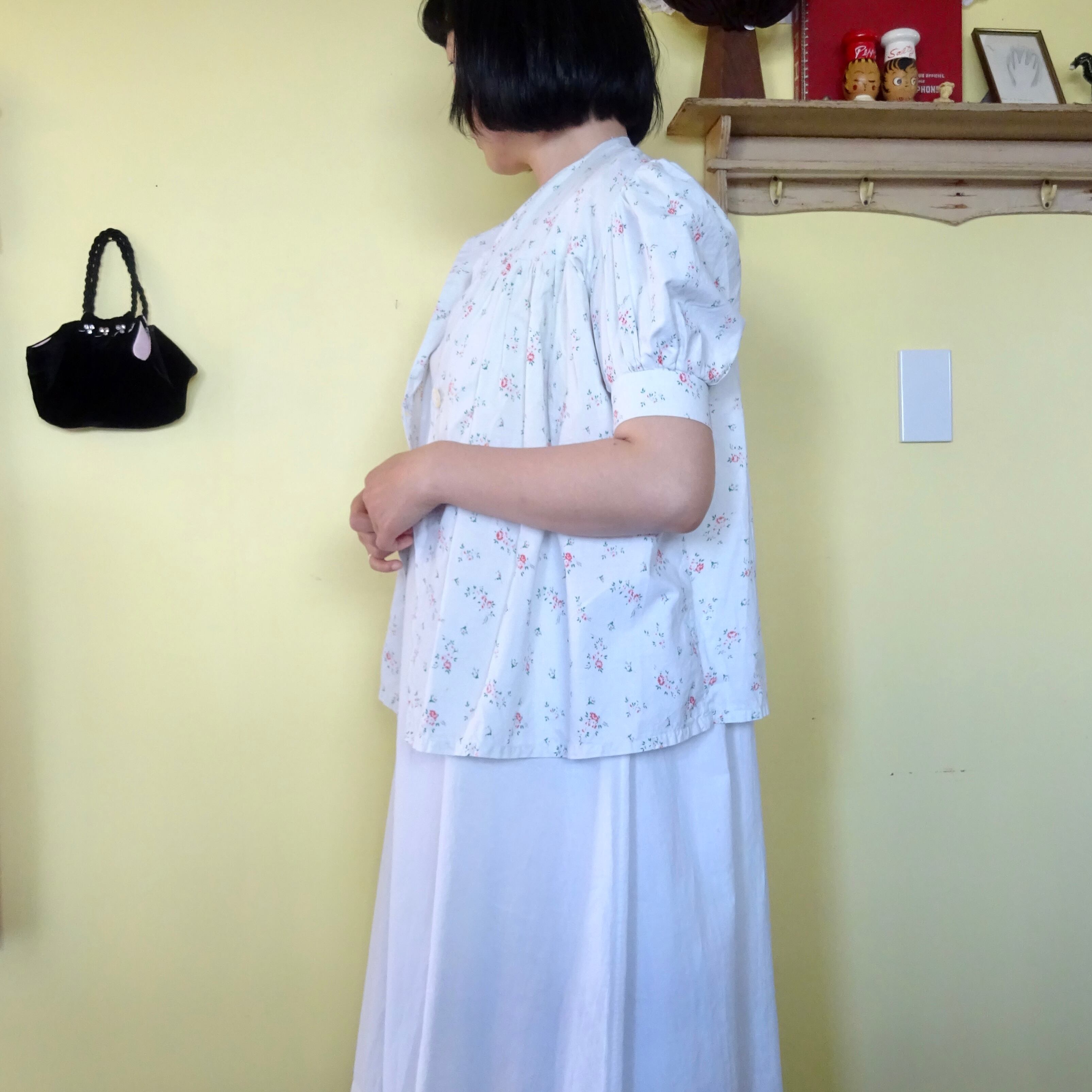 勿忘草のような儚いお花の柄がなんとも可愛いお家で着る用のふんわりした作りのブラウス。