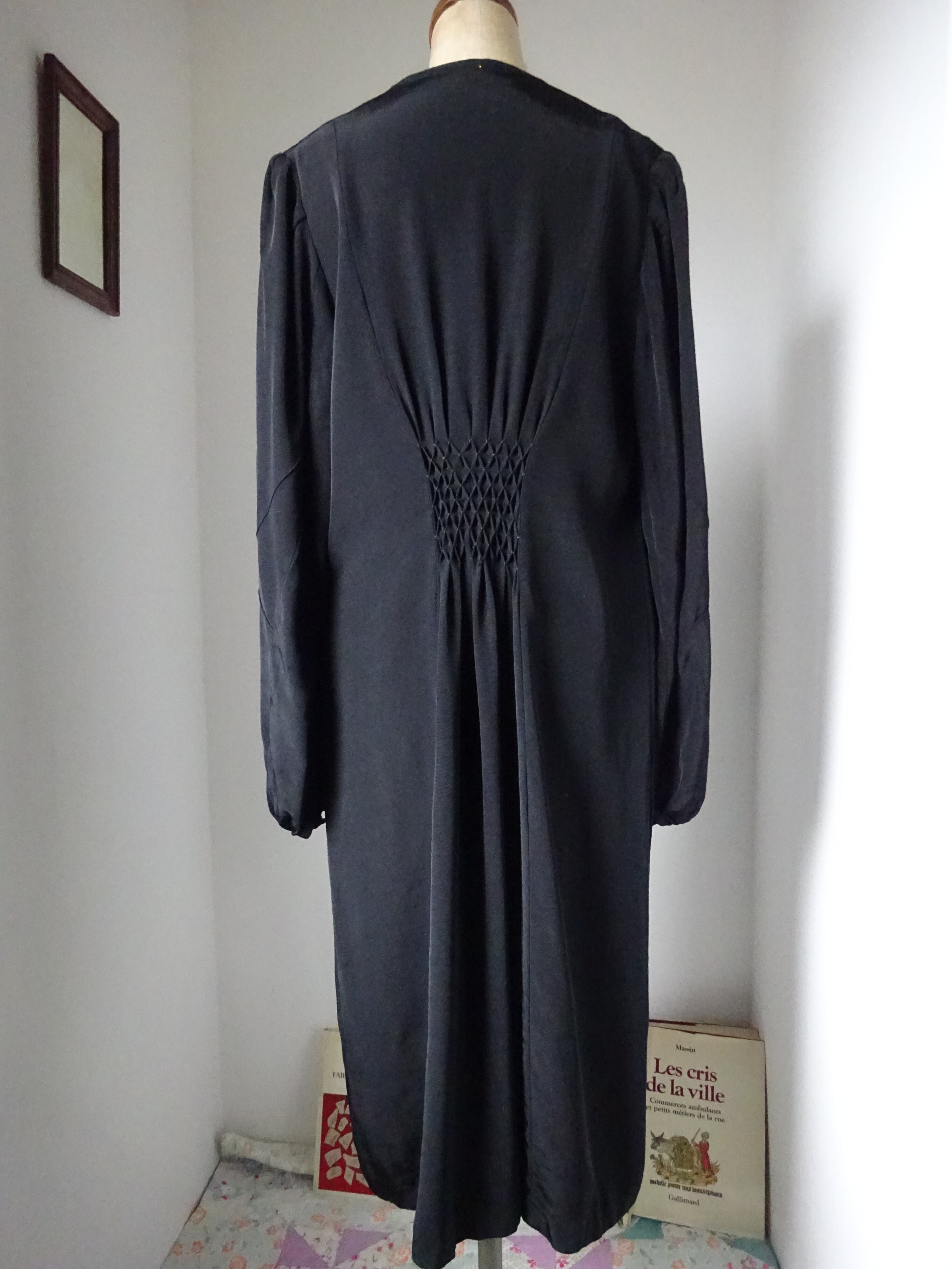畝織りと、滑らかな光沢のある2種類の生地を使った黒い光沢のコントラストが美しいドレス