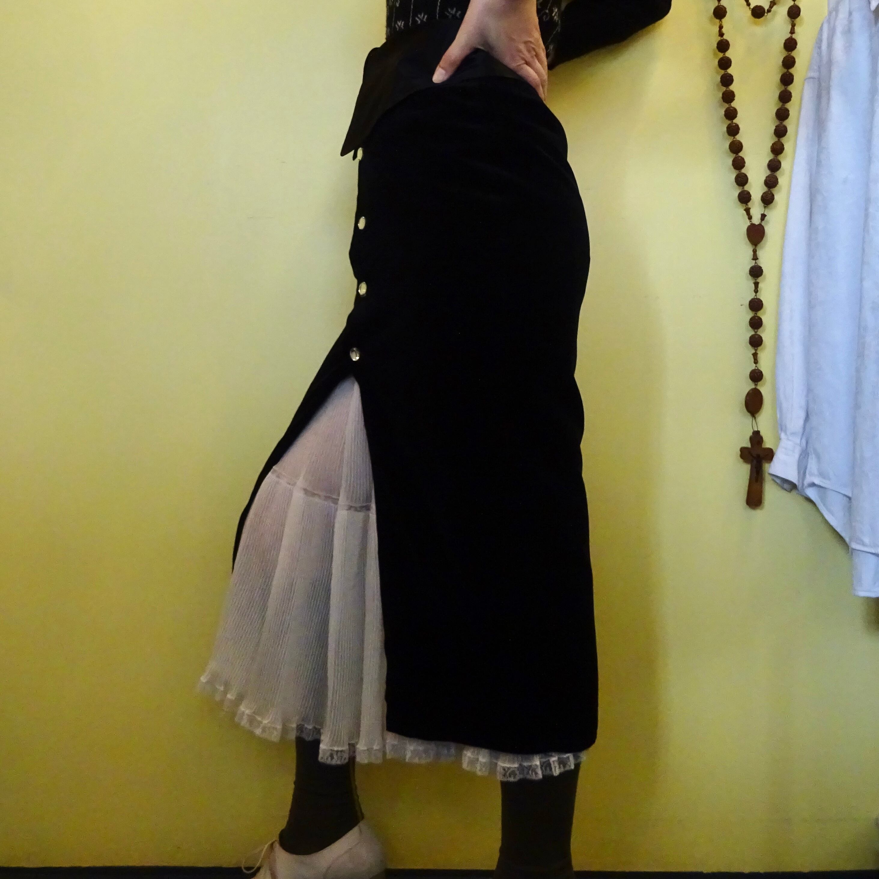 サテンの大きな襟にベルベットのタイトなロングスカート
