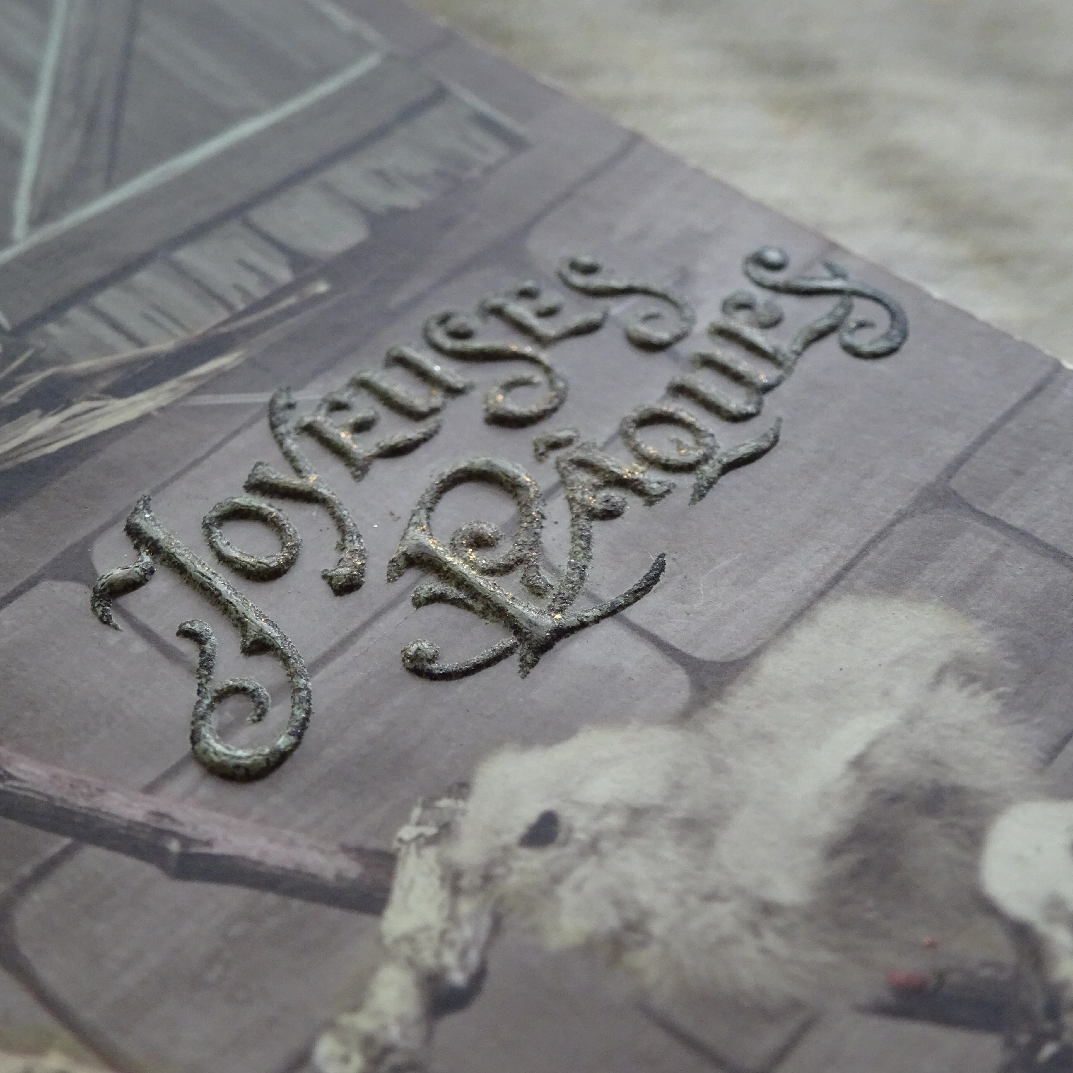 イースターのお祝い "Joyeuses Pâques" の文字がエンボスになっているリアルなヒヨコのポストカード