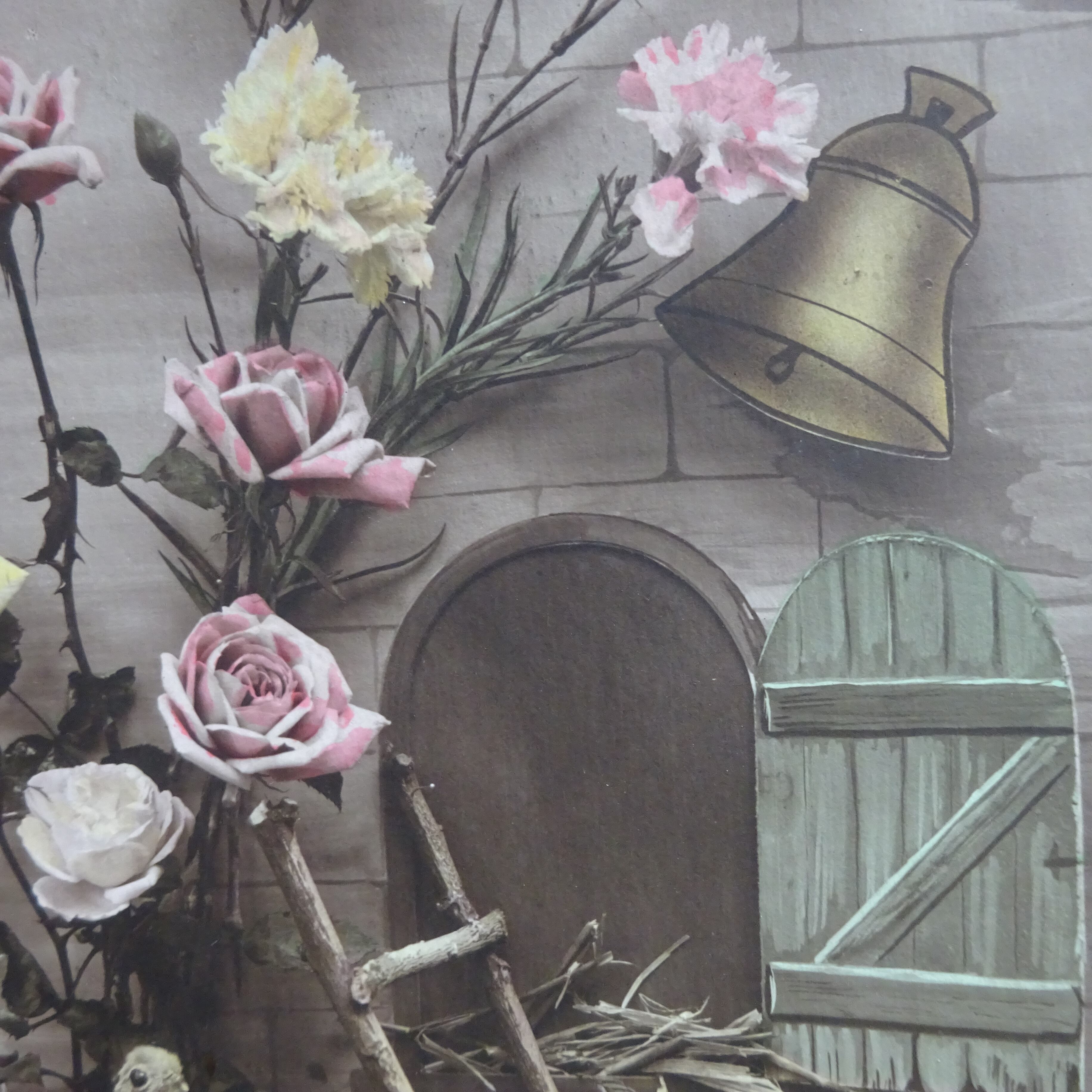 セピア写真の上から手彩飾する技法で、やけにリアルなヒヨコと、イラスト感がすごいベルと小窓が絶妙な雰囲気を醸し出しています。