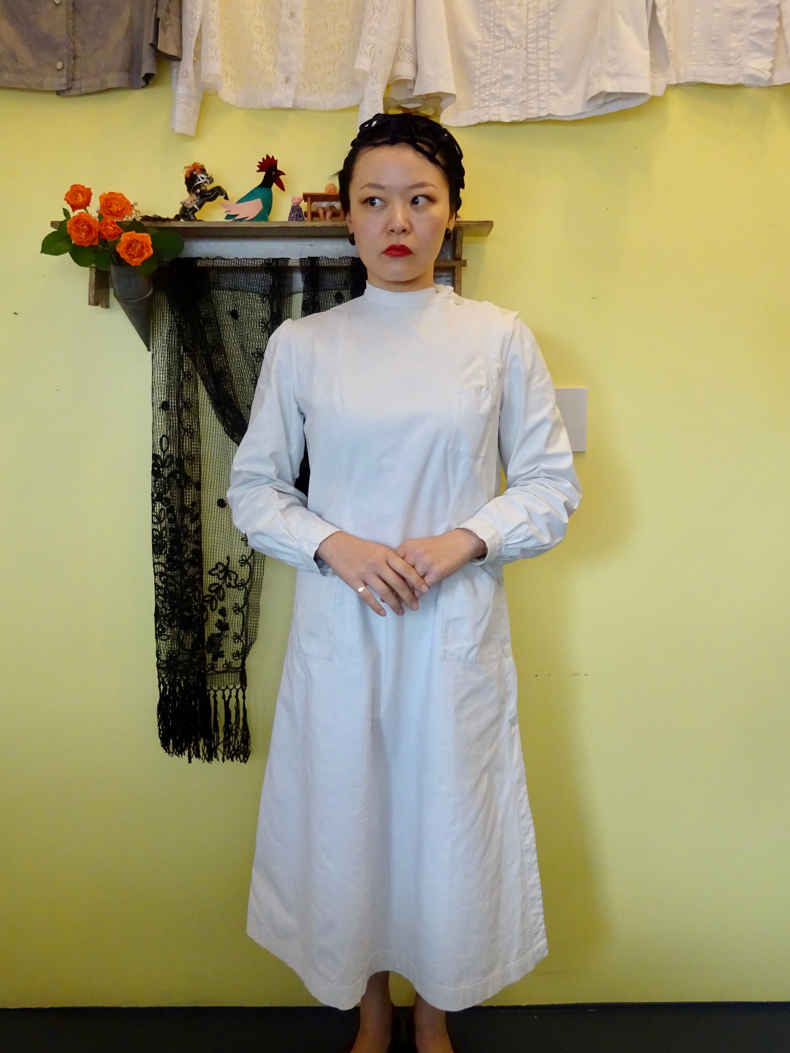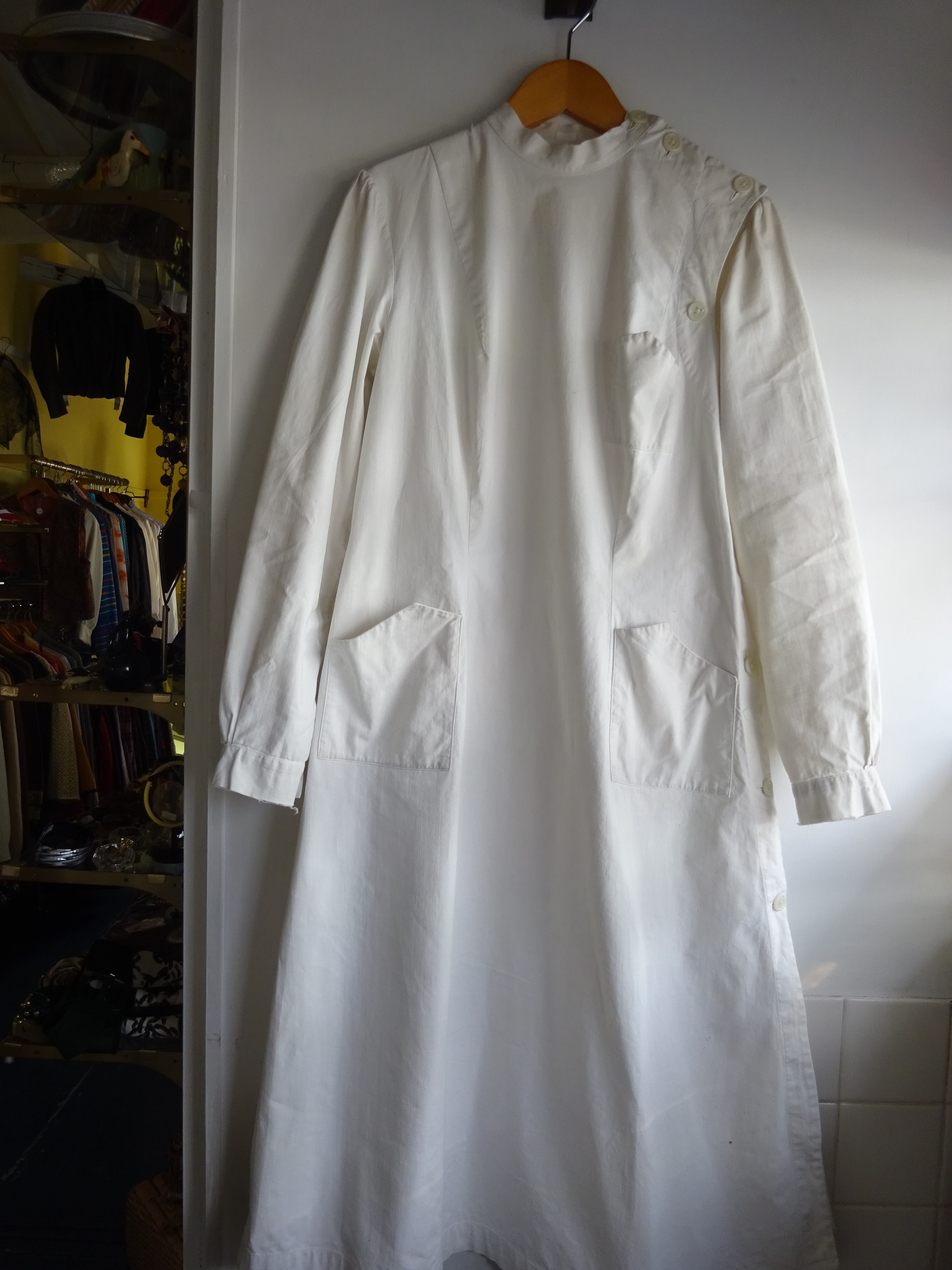 古いナースドレスとなると着れる状態のものを仕入れるのも最早困難で、販売するかも迷ってしまうほどの逸品ですが、この度適度なリペアを施してご紹介しております。